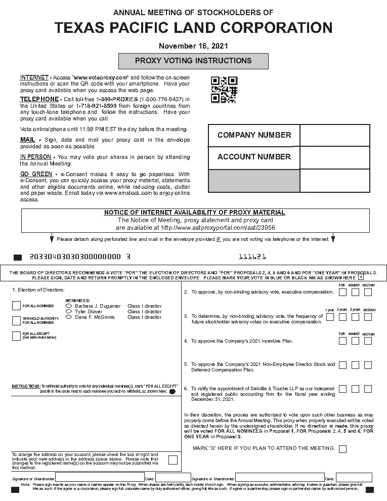 To change the address on your account, please check the box at right and indicate your new address in the address space above. Please note that changes to the registered name(s) on the account may not be submitted via this method. JOHN SMITH 1234 MAIN STREET APT. 203 NEW YORK, NY 10038 INTERNET - Access “www.voteproxy.com” and follow the on-screen instructions or scan the QR code with your smartphone. Have your proxy card available when you access the web page. TELEPHONE - Call toll-free 1-800-PROXIES (1-800-776-9437) in the United States or 1-718-921-8500 from foreign countries from any touch-tone telephone and follow the instructions. Have your proxy card available when you call. Vote online/phone until 11:59 PM EST the day before the meeting. MAIL - Sign, date and mail your proxy card in the envelope provided as soon as possible. IN PERSON - You may vote your shares in person by attending the Annual Meeting. GO GREEN - e-Consent makes it easy to go paperless. With e-Consent, you can quickly access your proxy material, statements and other eligible documents online, while reducing costs, clutter and paper waste. Enroll today via www.amstock.com to enjoy online access. PROXY VOTING INSTRUCTIONS Please detach along perforated line and mail in the envelope provided IF you are not voting via telephone or the Internet. THE BOARD OF DIRECTORS RECOMMENDS A VOTE “FOR” THE ELECTION OF DIRECTORS AND “FOR” PROPOSALS 2, 4, 5 AND 6 AND FOR “ONE YEAR” IN PROPOSAL 3. PLEASE SIGN, DATE AND RETURN PROMPTLY IN THE ENCLOSED ENVELOPE. PLEASE MARK YOUR VOTE IN BLUE OR BLACK INK AS SHOWN HERE x 20330403030300000000 3 111621 COMPANY NUMBER ACCOUNT NUMBER NOTICE OF INTERNET AVAILABILITY OF PROXY MATERIAL: The Notice of Meeting, proxy statement and proxy card are available at http://www.astproxyportal.com/ast/23956 ANNUAL MEETING OF STOCKHOLDERS OF TEXAS PACIFIC LAND CORPORATION November 16, 2021 Signature of Shareholder Date: Signature of Shareholder Date: Note: Please sign exactly as your name or names appear on this Proxy. When shares are held jointly, each holder should sign. When signing as executor, administrator, attorney, trustee or guardian, please give full title as such. If the signer is a corporation, please sign full corporate name by duly authorized officer, giving full title as such. If signer is a partnership, please sign in partnership name by authorized person. 1. Election of Directors: MARK “X” HERE IF YOU PLAN TO ATTEND THE MEETING. O Barbara J. Duganier Class I director O Tyler Glover Class I director O Dana F. McGinnis Class I director FOR ALL NOMINEES WITHHOLD AUTHORITY FOR ALL NOMINEES FOR ALL EXCEPT (See instructions below) NOMINEES: 2. To approve, by non-binding advisory vote, executive compensation. 3. To determine, by non-binding advisory vote, the frequency of future stockholder advisory votes on executive compensation. 4. To approve the Company’s 2021 Incentive Plan. 5. To approve the Company’s 2021 Non-Employee Director Stock and Deferred Compensation Plan. 6. To ratify the appointment of Deloitte & Touche LLP as our independent registered public accounting firm for the fiscal year ending December 31, 2021. In their discretion, the proxies are authorized to vote upon such other business as may properly come before the Annual Meeting. This proxy when properly executed will be voted as directed herein by the undersigned shareholder. If no direction is made, this proxy will be voted FOR ALL NOMINEES in Proposal 1, FOR Proposals 2, 4, 5 and 6, FOR ONE YEAR in Proposal 3. FOR AGAINST ABSTAIN 2 1 year years 3 years ABSTAIN FOR AGAINST ABSTAIN INSTRUCTIONS: To withhold authority to vote for any individual nominee(s), mark “FOR ALL EXCEPT” and fill in the circle next to each nominee you wish to withhold, as shown here: