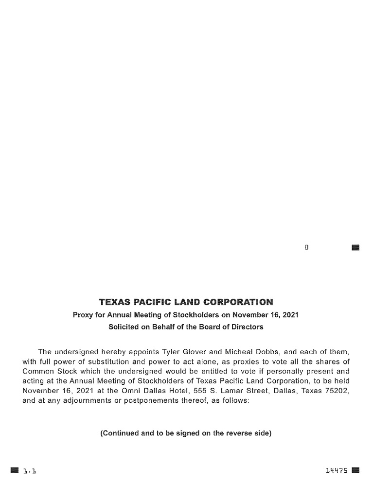 0 ------------------ . .. . . . . . . . . . . . . . . . . . . . . . . . . . . . . . . . . . . . . . . . . . . . . . . . . . . . . ---------------- 14475 TEXAS PACIFIC LAND CORPORATION Proxy for Annual Meeting of Stockholders on November 16, 2021 Solicited on Behalf of the Board of Directors The undersigned hereby appoints Tyler Glover and Micheal Dobbs, and each of them, with full power of substitution and power to act alone, as proxies to vote all the shares of Common Stock which the undersigned would be entitled to vote if personally present and acting at the Annual Meeting of Stockholders of Texas Pacific Land Corporation, to be held November 16, 2021 at the Omni Dallas Hotel, 555 S. Lamar Street, Dallas, Texas 75202, and at any adjournments or postponements thereof, as follows: (Continued and to be signed on the reverse side) 1.1