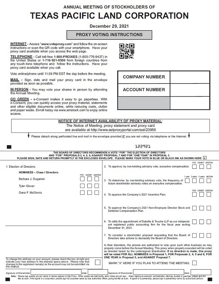 ANNUAL MEETING OF STOCKHOLDERS OF TEXAS PACIFIC LAND CORPORATION December 29, 2021 INTERNET -Access “www.voteproxy.com”and followtheon-screen instructions or scan the QR code with your smartphone. Have your proxy card available when you access the web page. TELEPHONE -Call toll-free 1-800-PROXIES (1-800-776-9437) in the United States or 1-718-921-8500 from foreign countries from any touch-tone telephone and follow the instructions. Have your proxy card available when you call. Vote online/phone until 11:59 PM EST the day before the meeting. MAIL -Sign, date and mail your proxy card in the envelope provided as soon as possible. IN PERSON -You may vote your shares in person by attending the Annual Meeting. GO GREEN -e-Consent makes it easy to go paperless. With e-Consent, you can quickly access your proxy material, statements and other eligible documents online, while reducing costs, clutter and paper waste. Enroll today via www.amstock.com to enjoyonline access. COMPANY NUMBER ACCOUNT NUMBER NOTICE OF INTERNET AVAILABILITY OF PROXY MATERIAL: The Notice of Meeting, proxy statement and proxy card are available at http://www.astproxyportal.com/ast/23956 Please detach along perforated line and mail in the envelope provided IF you are not voting via telephone or the Internet. 122921 THE BOARD OF DIRECTORS RECOMMENDS A VOTE “FOR” THE ELECTION OF DIRECTORS AND “FOR” PROPOSALS 2,4,5,6, AGAINST PROPOSAL 7 AND FOR “ONE YEAR” IN PROPOSAL 3. PLEASE SIGN, DATE AND RETURN PROMPTLY IN THE ENCLOSED ENVELOPE. PLEASE MARKYOUR VOTE IN BLUE OR BLACK INK AS SHOWN HERE 1.Election of Directors :NOMINEES– Class I Directors :Barbara J. Duganier Tyler Glover Dana F.McGinnis FOR AGAINST ABSTAIN 2.To approve,by non-binding advisory vote,executive compensation.3.To determine,by non binding advisory vote,the frequency of future stockholder advisory votes on executive compensation.4.To approve the Company’s 2021 Incentive Plan.5.To approve the Company’s 2021 Non-Employee Director Stock and Deferred Compensation Plan.6.To ratify the appointment of Deloitte & Touche LLP as our independ-ent registered public accounting firm for the fiscal year ending December 31,2021. 7.To consider a stockholder proposal requesting that the Board of Directors take actions to declassify the Board of Directors. In their discretion, the proxies are authorized to vote upon such other business as may properly come before the Annual Meeting. This proxy when properly executed will be voted as directed herein by the undersigned shareholder.If no direction is made,this proxy will be voted FOR ALL NOMINEES in Proposal 1,FOR Proposals 2,4,5 and 6,FOR ONE YEAR in Proposal 3,and AGAINST Proposal 7. MARK “X” HERE IF YOU PLAN TO ATTEND THE MEETING. To change the address on your account, please check the box at right and indicate your new address in the addresss pace above.Please note that changes to the registered name(s) on the account may not be submitted via this method. Signature of Shareholder Date Note: Please sign exactly as your name or names appear on this Proxy. When shares are held jointly, each holder should sign. When signing as executor, administrator, attorney, trustee or guardian, please give full title as such. If the signer is a corporation, please sign full corporate name by duly authorized officer, giving full title as such. If signer is a partnership, please sign in partnership name by authorized person.