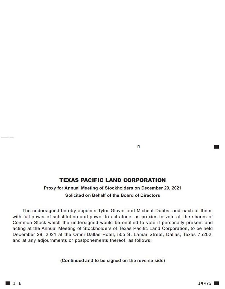 TEXAS PACIFIC LAND CORPORATION Proxy for Annual Meeting of Stockholders on December 29, 2021 Solicited on Behalf of the Board of Directors The undersigned hereby appoints Tyler Glover and Micheal Dobbs, and each of them, with full power of substitution and power to act alone, as proxies to vote all the shares of Common Stock which the undersigned would be entitled to vote if personally present and acting at the Annual Meeting of Stockholders of Texas Pacific Land Corporation, to be held December 29, 2021 at the Omni Dallas Hotel, 555 S. Lamar Street, Dallas, Texas 75202, and at any adjournments or postponements thereof, as follows: (Continued and to be signed on the reverse side) 1.1 14475
