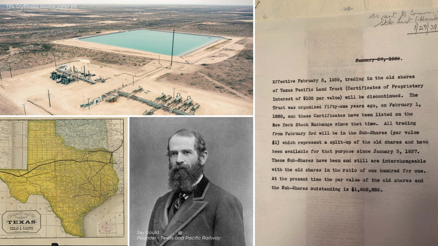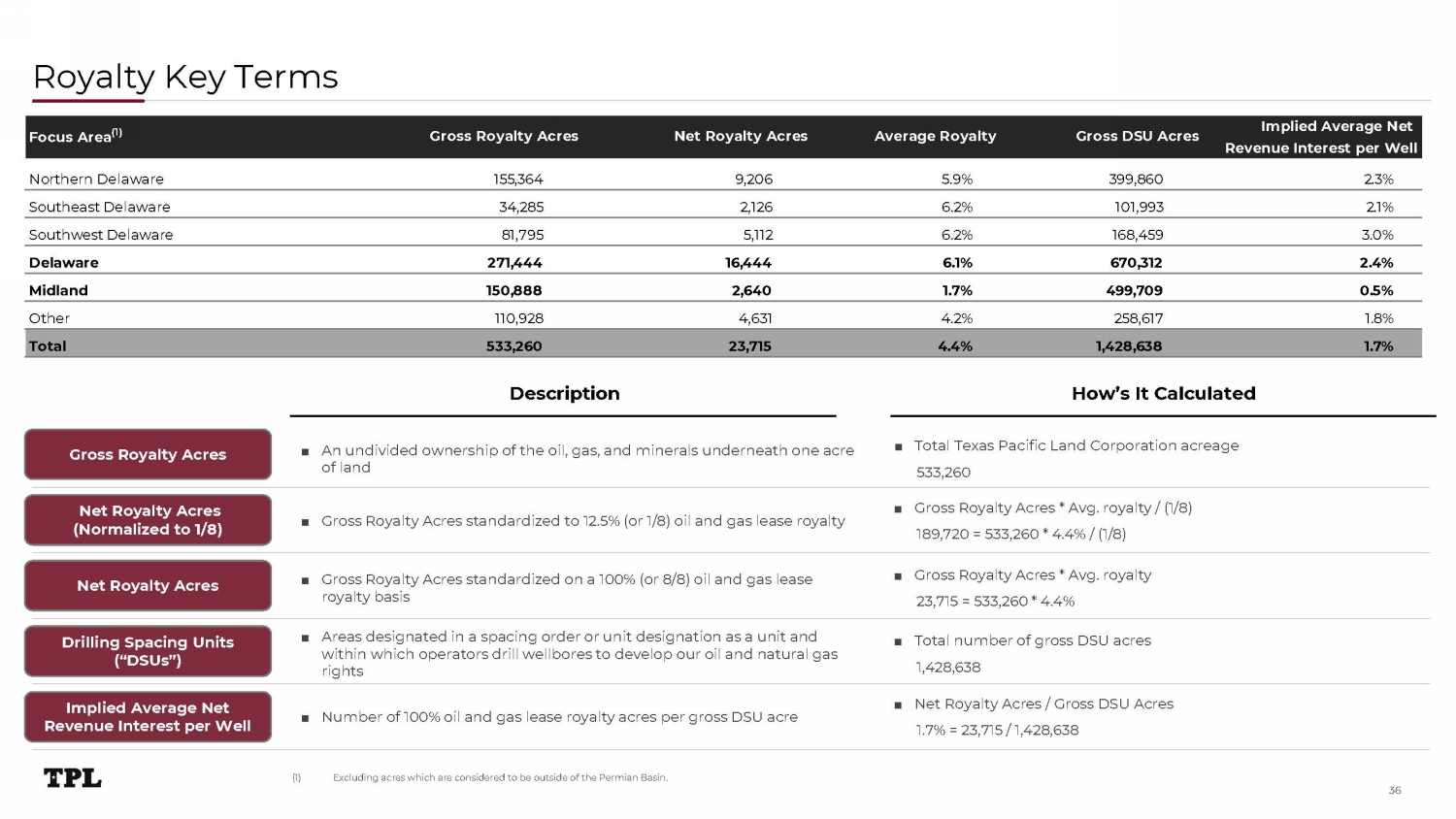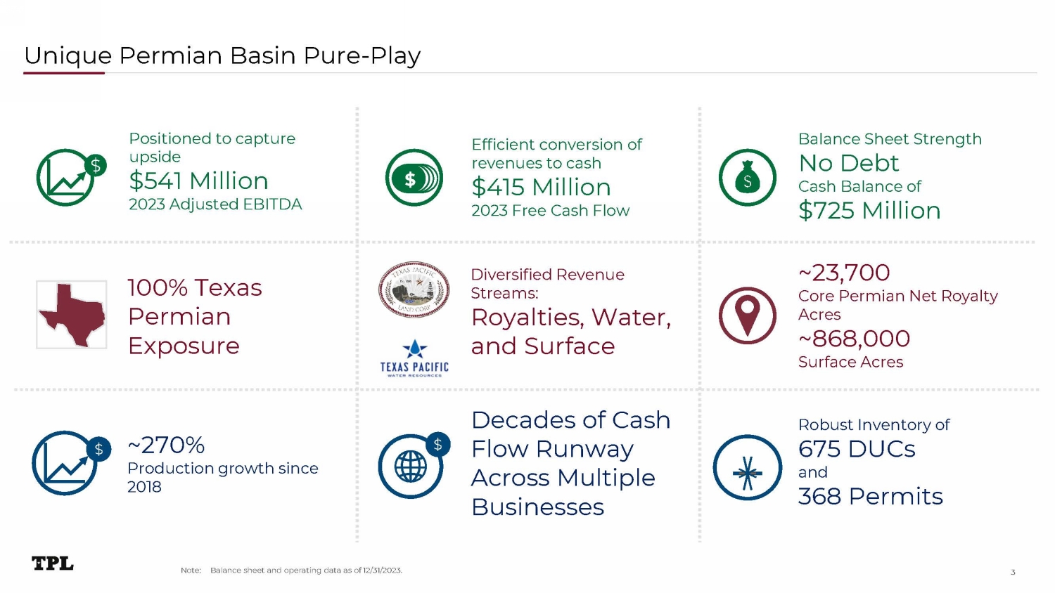 Disclaimers This presentation has been designed to provide general information about Texas Pacific Land Corporation and its subsidiaries (“TPL” or the “Company”). Any information contained or referenced herein is suitable only as an introduction to the Company. The recipient is strongly encouraged to refer to and supplement this presentation with information the Company has filed with the Securities and Exchange Commission (“SEC”). The Company makes no representation or warranty, express or implied, as to the accuracy or completeness of the information contained in this presentation, and nothing contained herein is, or shall be, relied upon as a promise or representation, whether as to the past or to the future. This presentation does not purport to include all of the information that may be required to evaluate the subject matter herein and any recipient hereof should conduct its own independent analysis of the Company and the data contained or referred to herein. Unless otherwise stated, statements in this presentation are made as of the date of this presentation, and nothing shall create an implication that the information contained herein is correct as of any time after such date. TPL reserves the right to change any of its opinions expressed herein at any time as it deems appropriate. The Company disclaims any obligations to update the data, information or opinions contained herein or to notify the market or any other party of any such changes, other than required by law. Industry and Market Data The Company has neither sought nor obtained consent from any third party for the use of previously published information. Any such statements or information should not be viewed as indicating the support of such third party for the views expressed herein. The Company shall not be responsible or have any liability for any misinformation contained in any third party report, SEC or other regulatory filing. The industry in which the Company operates is subject to a high degree of uncertainty and risk due to a variety of factors, which could cause our results to differ materially from those expressed in these third - party publications. Some of the data included in this presentation is based on TPL’s good faith estimates, which are derived from TPL’s review of internal sources as well as the third party sources described above. All registered or unregistered service marks, trademarks and trade names referred to in this presentation are the property of their respective owners, and TPL’s use herein does not imply an affiliation with, or endorsement by, the owners of these service marks, trademarks and trade names. Forward - looking Statements This presentation contains certain forward - looking statements within the meaning of the U.S. federal securities laws that are based on TPL’s beliefs, as well as assumptions made by, and information currently available to, TPL, and therefore involve risks and uncertainties that are difficult to predict. These statements include, but are not limited to, statements about strategies, plans, objectives, expectations, intentions, expenditures and assumptions and other statements that are not historical facts. When used in this document, words such as “anticipate,” “believe,” “estimate,” “expect,” “intend,” “plan” and “project” and similar expressions are intended to identify forward - looking statements. You should not place undue reliance on these forward - looking statements. Although we believe our plans, intentions and expectations reflected in or suggested by the forward - looking statements we make in this presentation are reasonable, we may be unable to achieve these plans, intentions or expectations and actual results, performance or achievements may vary materially and adversely from those envisaged in this document. For more information concerning factors that could cause actual results to differ from those expressed or forecasted, see TPL’s annual report on Form 10 - K and quarterly reports on Form 10 - Q filed with the SEC. The tables, graphs, charts and other analyses provided throughout this document are provided for illustrative purposes only and there is no guarantee that the trends, outcomes or market conditions depicted on them will continue in the future. There is no assurance or guarantee with respect to the prices at which the Company’s common stock will trade, and such securities may not trade at prices that may be implied herein. TPL’s forecasts and expectations for future periods are dependent upon many assumptions, including the drilling and development plans of our customers, estimates of production and potential drilling locations, which may be affected by commodity price declines or other factors that are beyond TPL’s control. These materials are provided merely for general informational purposes and are not intended to be, nor should they be construed as 1) investment, financial, tax or legal advice, 2) a recommendation to buy or sell any security, or 3) an offer or solicitation to subscribe for or purchase any security. These materials do not consider the investment objective, financial situation, suitability or the particular need or circumstances of any specific individual who may receive or review this presentation, and may not be taken as advice on the merits of any investment decision. Although TPL believes the information herein to be reliable, the Company and persons acting on its behalf make no representation or warranty, express or implied, as to the accuracy or completeness of those statements or any other written or oral communication it makes, safe as provided for by law, and the Company expressly disclaims any liability relating to those statements or communications (or any inaccuracies or omissions therein). These cautionary statements qualify all forward - looking statements attributable to us or persons acting on our behalf. Non - GAAP Financial Measures In addit
