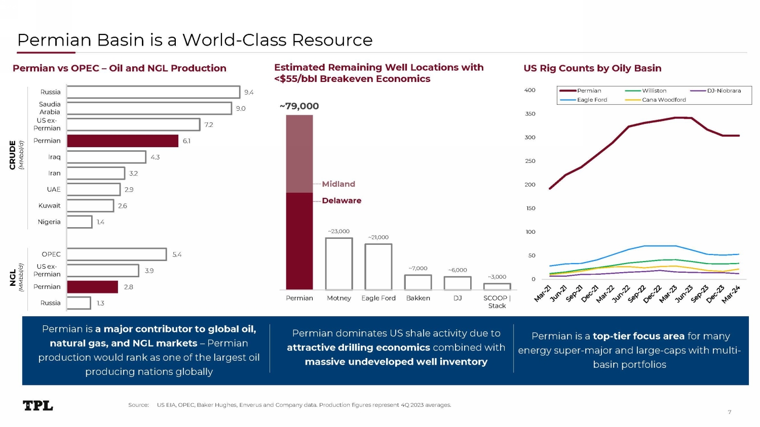 ~7 9 , 000 ~ 2 3 , 000 ~ 2 1 , 000 ~ 7 , 000 ~ 6 , 000 ~ 3 , 000 P e r m i an M o t n e y Eagle Ford Bakken DJ SCOOP | Stack Permian Basin is a World - Class Resource Source: US EIA, OPEC, Baker Hughes, Enverus and Company data. Production figures represent 4Q 2023 averages. Estimated Remaining Well Locations with <$55/bbl Breakeven Economics Permian dominates US shale activity due to attractive drilling economics combined with massive undeveloped well inventory Permian is a top - tier focus area for many energy super - major and large - caps with multi - basin portfolios Permian is a major contributor to global oil, natural gas, and NGL markets – Permian production would rank as one of the largest oil producing nations globally 1.3 2 .8 3 . 9 5 . 4 1.4 2 .6 2 .9 3 .2 4. 3 6 .1 7 . 2 9 .0 9 .4 R u s s i a O P EC US ex - P e r m i an P e r m i an N i g e r i a Kuwait UAE I r an I r aq R u s s i a S a u d i a Arabia US ex - P e r m i an P e r m i an CR U D E ( MMbbl/d) NGL (MMbb l / d ) Permian vs OPEC – Oil and NGL Production US Rig Counts by Oily Basin Delaware M i d l a n d 0 50 1 0 0 15 0 2 0 0 25 0 3 0 0 3 50 4 00 DJ - Niobrara Permian Eagle Ford Williston Cana Woodford 7
