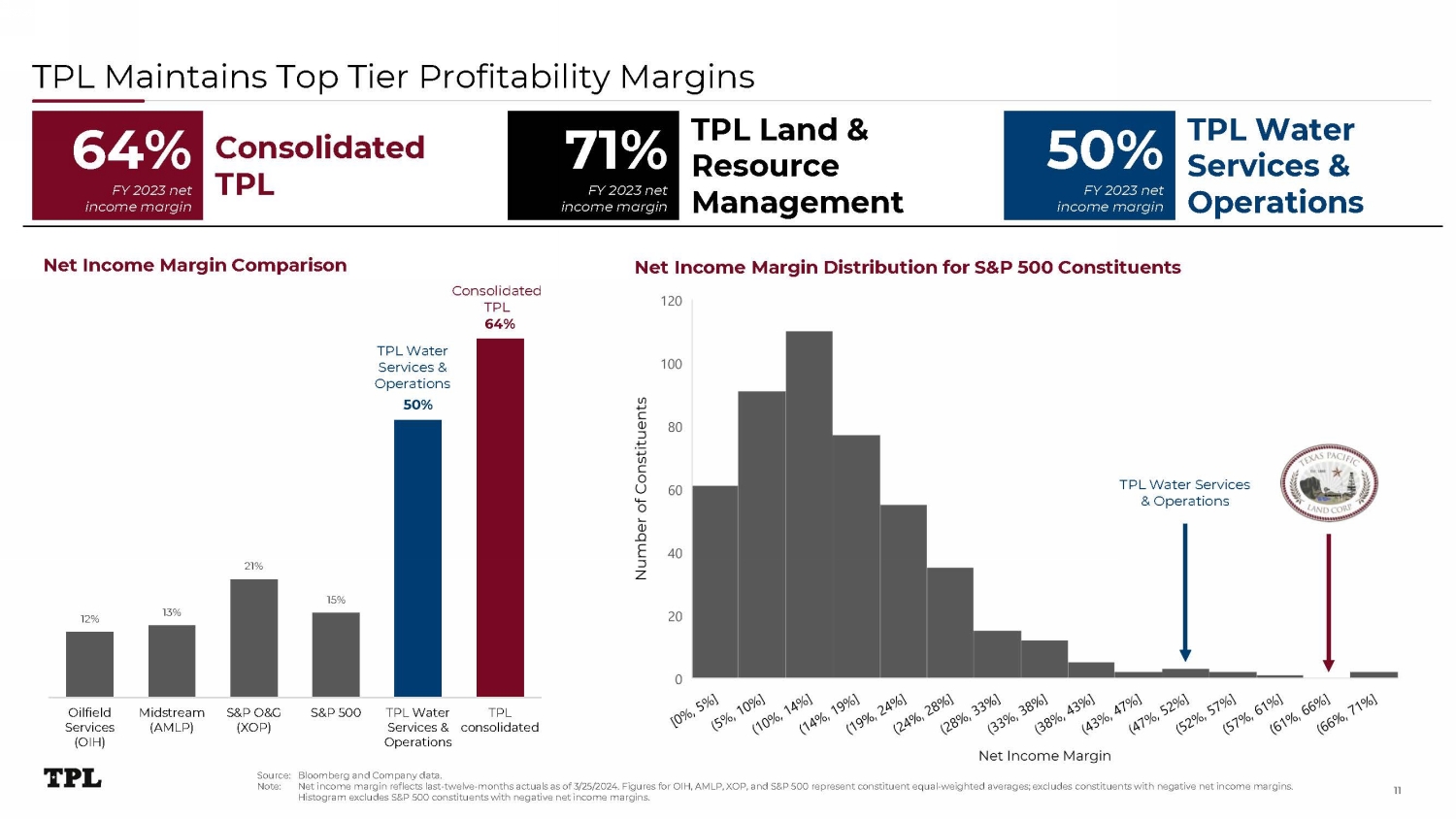 TPL Maintains Top Tier Profitability Margins 12% 13 % 21% 15 % C o n s o li d a t e d TPL 64% TPL Water Services & O p e r a t i o n s 50% Oilfield S e r v i c es (OIH) Mi d s t r e a m (AMLP) S&P O&G (XOP) S&P 500 TPL Water Services & O p e r a t i o n s TPL consolidated Net Income Margin Comparison Source: Bloomberg and Company data. Note: Net income margin reflects last - twelve - months actuals as of 3/25/2024. Figures for OIH, AMLP, XOP, and S&P 500 represent constituent equal - weighted averages; excludes constituents with negative net income margins. Histogram excludes S&P 500 constituents with negative net income margins. Net Income Margin Distribution for S&P 500 Constituents C on s oli d a t ed TPL 64% FY 2023 net income margin TPL Land & Resource M a na g em ent 71% FY 2023 net income margin TPL Water Services & O p e r a t ions 50% FY 2023 net income margin TPL Water Services & Operations 11