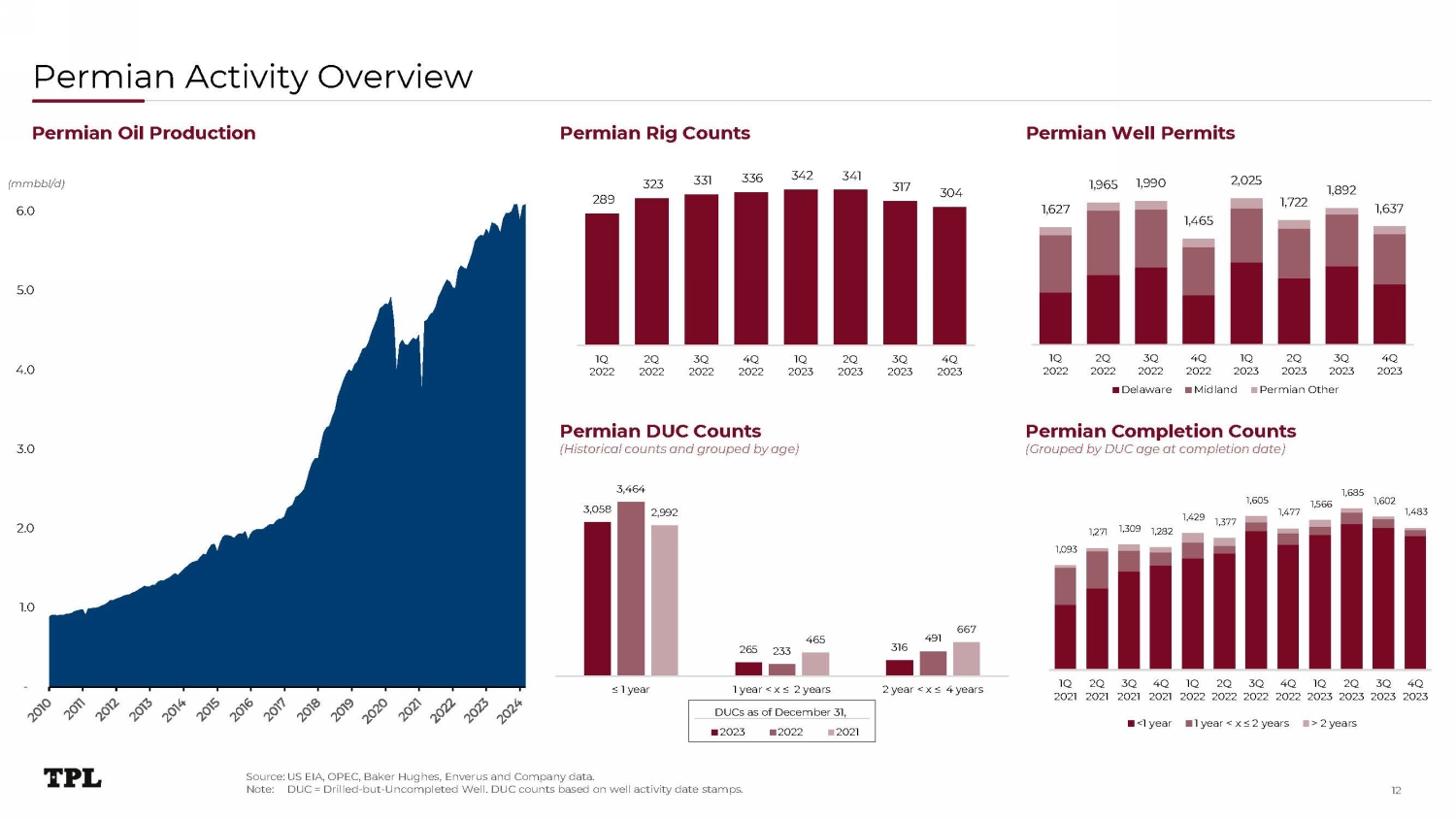 Permian Activity Overview 12 3 , 0 5 8 2 6 5 3 1 6 3 , 464 2 33 491 2 ,9 9 2 465 66 7 ≤ 1 year 1 year < x ≤ 2 years 2 year < x ≤ 4 years DUCs as of December 31, 2023 2022 2021 - 1 .0 2 .0 3 .0 4 .0 5 .0 6 .0 1,093 1 , 2 7 1 1,309 1,282 1,429 1,377 1 , 6 0 5 1 , 4 77 1 , 5 66 1 , 6 8 5 1 , 6 0 2 1 , 4 8 3 1Q 2Q 3Q 4Q 1Q 2Q 3Q 4Q 1Q 2Q 3Q 4Q 2021 2021 2021 2021 2022 2022 2022 2022 2023 2023 2023 2023 <1 year 1 year < x ≤ 2 years > 2 years 1,6 2 7 1,9 6 5 1,9 9 0 1,4 6 5 2,025 1, 7 2 2 1, 8 9 2 1,6 3 7 1Q 2Q 3Q 4Q 1Q 2Q 3Q 4Q 1Q 2Q 3Q 4Q 1Q 2Q 3Q 4Q 2022 2022 2022 2 0 22 2023 2023 2023 2023 2 0 22 2022 2022 Delaware 2022 M i d la 2023 2023 nd Permian O 2023 ther 2023 Permian Well Permits Permian Rig Counts Permian Oil Production Permian Completion Counts (Grouped by DUC age at completion date) (mmbbl/d) 2 8 9 3 2 3 331 336 3 42 3 41 3 1 7 3 04 Permian DUC Counts (Historical counts and grouped by age) Source: US EIA, OPEC, Baker Hughes, Enverus and Company data. Note: DUC = Drilled - but - Uncompleted Well. DUC counts based on well activity date stamps.