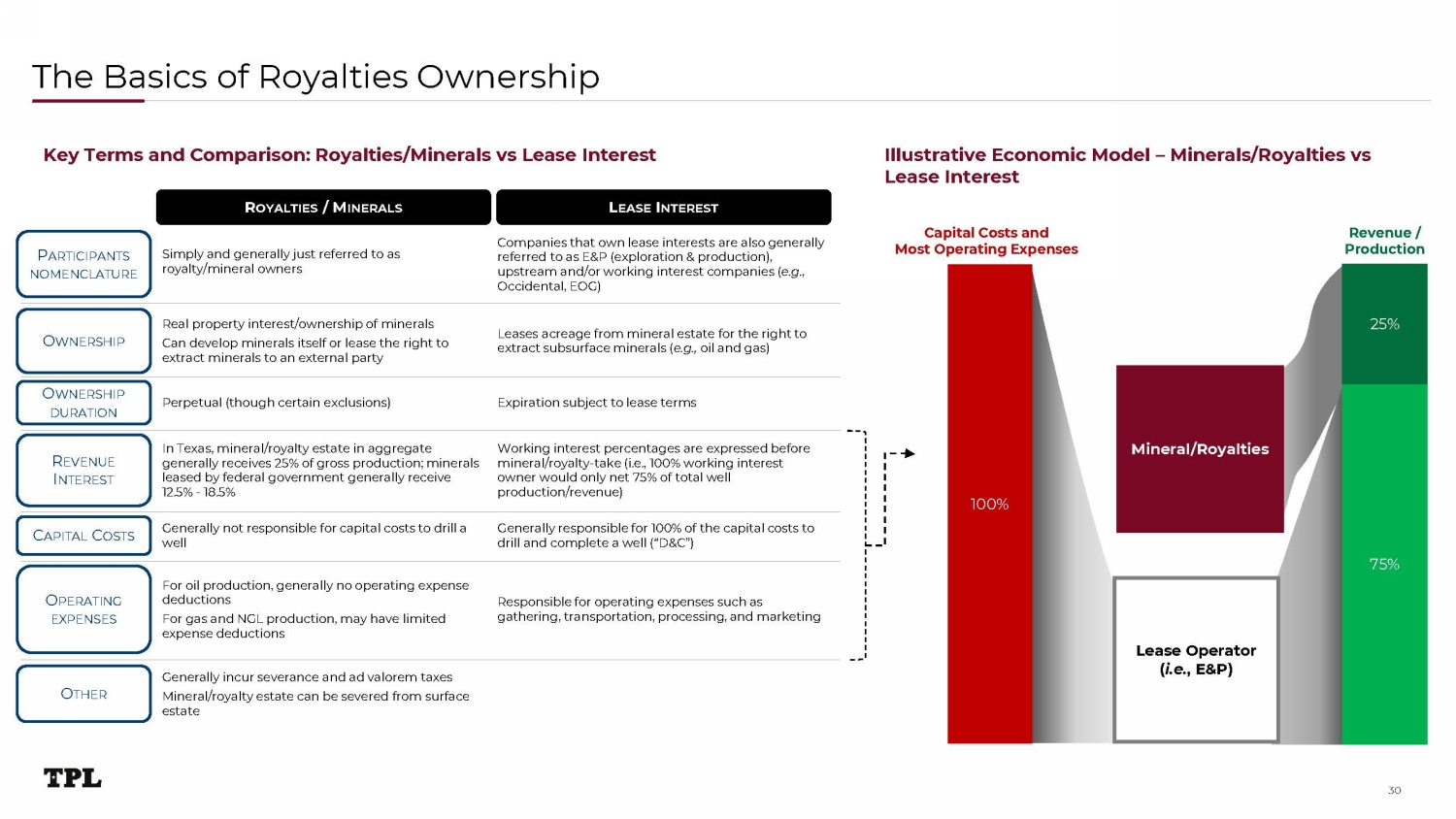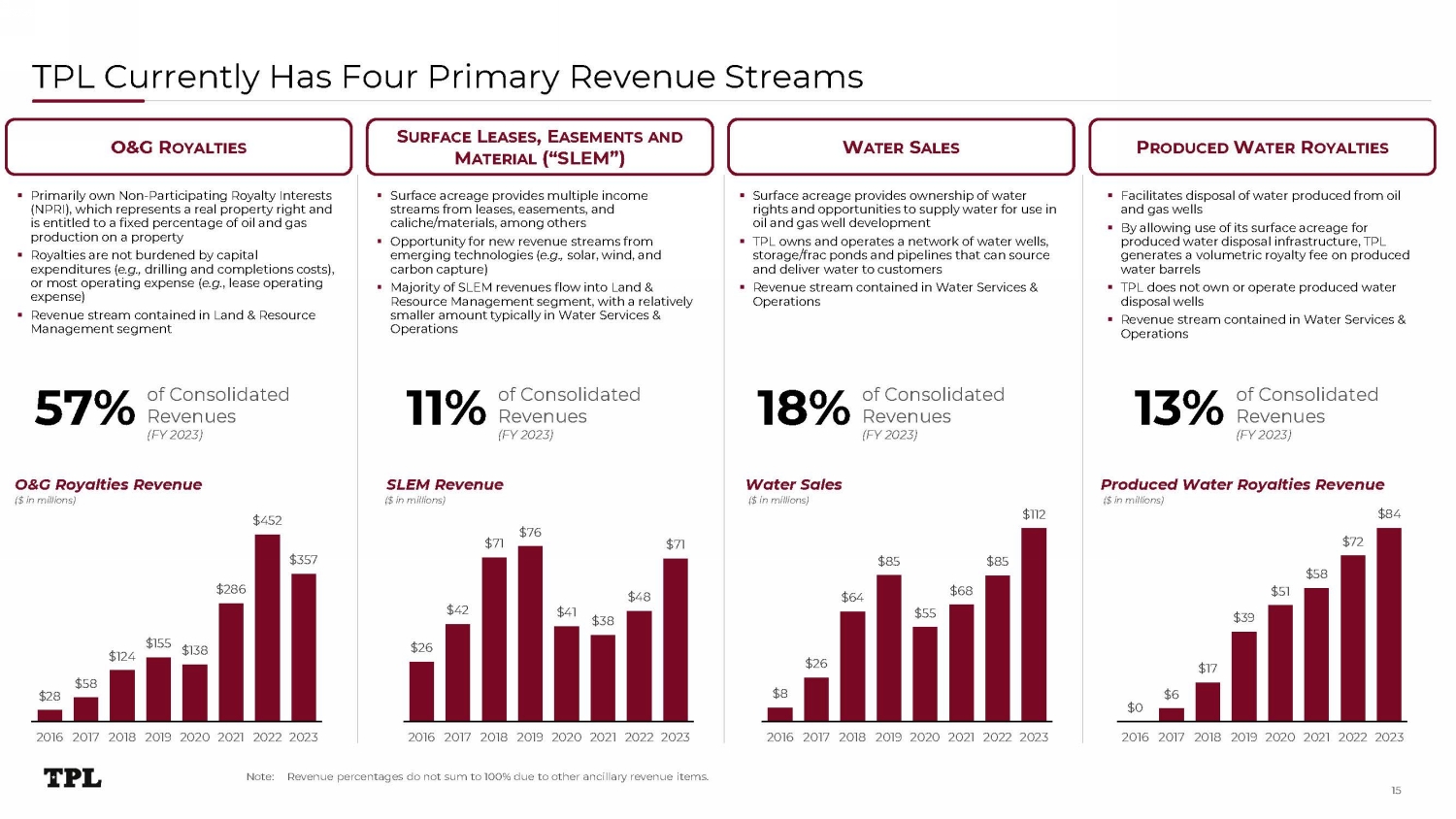 TPL Currently Has Four Primary Revenue Streams ▪ Primarily own Non - Participating Royalty Interests (NPRI), which represents a real property right and is entitled to a fixed percentage of oil and gas production on a property ▪ Royalties are not burdened by capital expenditures ( e.g., drilling and completions costs), or most operating expense ( e.g. , lease operating expense) ▪ Revenue stream contained in Land & Resource Management segment ▪ Surface acreage provides multiple income streams from leases, easements, and caliche/materials, among others ▪ Opportunity for new revenue streams from emerging technologies ( e.g., solar, wind, and carbon capture) ▪ Majority of SLEM revenues flow into Land & Resource Management segment, with a relatively smaller amount typically in Water Services & Operations ▪ Facilitates disposal of water produced from oil and gas wells ▪ By allowing use of its surface acreage for produced water disposal infrastructure, TPL generates a volumetric royalty fee on produced water barrels ▪ TPL does not own or operate produced water disposal wells ▪ Revenue stream contained in Water Services & Operations $2 8 $ 5 8 $155 $138 $124 $2 8 6 $4 5 2 $ 3 5 7 2016 2017 2018 2019 2020 2021 2022 2023 O&G R OYALTIES S URFACE L EASES , E ASEMENTS AND M ATERIAL (“SLEM”) W ATER S ALES P RODUCED W ATER R OYALTIES ▪ Surface acreage provides ownership of water rights and opportunities to supply water for use in oil and gas well development ▪ TPL owns and operates a network of water wells, storage/frac ponds and pipelines that can source and deliver water to customers ▪ Revenue stream contained in Water Services & Operations $2 6 $42 $ 71 $ 76 $ 41 $ 3 8 $ 48 $ 71 2016 2017 2018 2019 2020 2021 2022 2023 SLEM Revenue ($ in millions) $8 $2 6 $ 6 4 $ 8 5 $ 5 5 $ 6 8 $ 8 5 $112 2016 2017 2018 2019 2020 2021 2022 2023 $0 $6 $17 $ 3 9 $ 5 1 $ 5 8 $ 72 Produced Water Royalties Revenue ($ in millions) $ 8 4 2016 2017 2018 2019 2020 2021 2022 2023 of Consolidated Revenues (FY 2023) 5 7 % Note: Revenue percentages do not sum to 100% due to other ancillary revenue items. of Consolidated Revenues (FY 2023) 11% of Consolidated Revenues (FY 2023) of Consolidated Revenues (FY 2023) 1 3% O&G Royalties Revenue ($ in millions) 1 8% Water Sales ($ in millions) 15