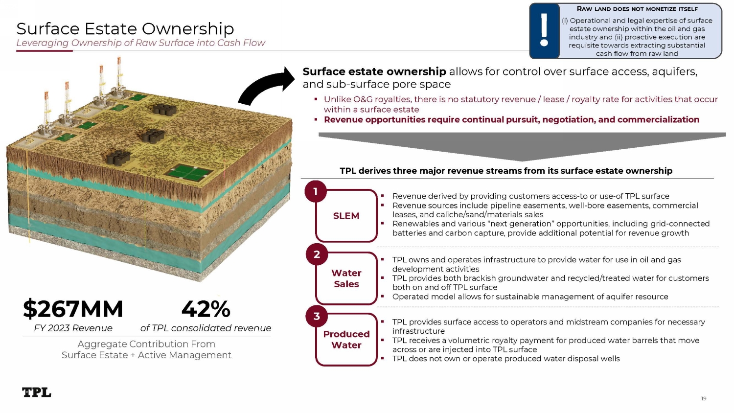 3 5% 1 3% 1 6 % 1 0 % 2 6% $ 1 00, 000 Illustrative Easement Renewal Payment Easement contracts generally have two 10 - year renewal payments at greater of 115% or CPI - escalation amount $115,000 $ 13 2 , 25 0 Year 0 Year 10 Year 20 Surface, Leases, Easements and Materials (SLEM) Overview and Management $ 7 1 M M Pipeline easements Caliche / materials Commercial leases Well bore easements Oth e r Provide operators/customers access - to or use - of TPL surface for infrastructure and materials TPL utilizes standardized forms and payment structures and delivers quick turnaround to operator customers TPL easements typically have initial 10 - year term with additional 10 - year renewal options for the life of the infrastructure Easement renewal payments generally the greater of 115% or CPI - escalation from the previous easement payment Installed infrastructure tends to be long - lived and/or permanent Amount of revenue opportunities generally correlates to development activity in the Permian Leveraging technology such as advanced GIS, satellite imaging, and automation tools to monitor surface activity Experienced, specialized land asset managers dedicated to all aspects of surface commercialization provide consistent operator interaction, contract execution, and trespass monitoring New activity developments on TPL land is shared across business groups for lead generation and revenue opportunities Employs numerous personnel focused on identifying and developing opportunities for new revenue streams Before active management, operators often trespassed and/or underpaid for activities on TPL land How TPL is Delivering Value TPL SLEM Revenue Breakdown (FY 2023) Revenue Mechanics and Management Potential for subsequent renewal payments 20