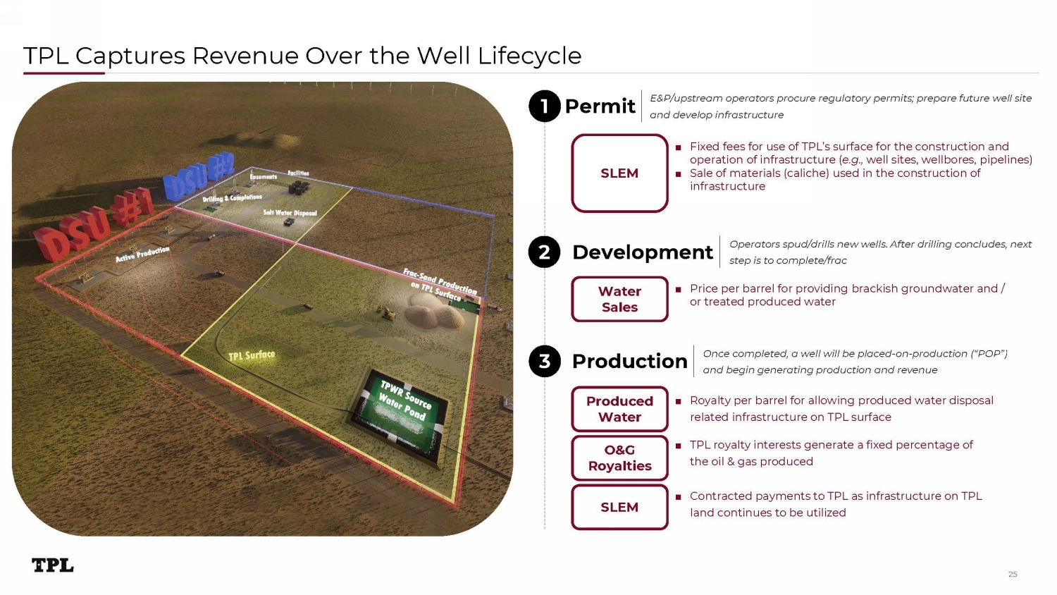 ~ 6 8 0 ~1 8 0 ~ 29 0 7 . 2 1 0 . 4 1 2. 9 1 3 . 5 1 4 . 5 1 8. 8 16.1 2 0 1 7 2 0 1 8 2 0 1 9 2 0 20 2 0 21 2 0 22 2 0 23 Produced Water Royalties Permian Produced Water (mmbbl/d) ~70% of overall Permian produced water comes from the Delaware Continued O&G development and growth in Delaware will drive produced water volume growth Delaware Upstream Activity + High Water - Cuts to Drive Produced Water Volume Growth Water vs Oil Production – Average Well in Delaware Basin (mbbl) First 12 months production First 36 months production ~ 1 , 220 P r o d u c e d O il Water P r o d u c e d O il Water Delaware O&G wells have relatively high water - cuts, ~4 barrels of produced water per barrel of oil on average TPL Produced Water AMI Drilling Rig TPL has executed numerous AMI (Area of Mutual Interest) agreements with operators – produced water volumes within the AMI are subject to a royalty fee Source: B3 Insight, Enverus and Company Data. Delaware oil and water volumes based on horizontal wells completed since 1/1/2018. TPL also generates significant revenue from water that originates from wells located off TPL acreage, including from New Mexico 24