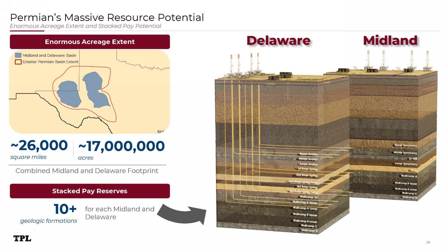 Permian’s Massive Resource Potential Enormous Acreage Extent and Stacked Pay Potential square miles ~26,000 ~17,000,000 a c r es 10 + geologic formations for each Midland and Delaware Enormous Acreage Extent Midland and Delaware Basin Greater Permian Basin Extent Combined Midland and Delaware Footprint Stacked Pay Reserves 26