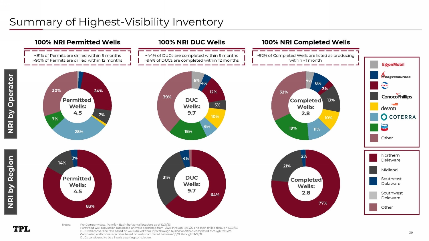 Summary of Highest - Visibility Inventory N o t e s: Per Company data. Permian Basin horizontal locations as of 12/31/23. Permitted well conversion rate based on wells permitted from 1/1/22 through 12/31/22 and then drilled through 12/31/23. DUC well conversion rate based on wells drilled from 1/1/22 through 12/31/22 and then completed through 12/31/23. Completed well conversion rates based on wells completed between 1/1/22 through 12/31/22 . DUCs considered to be all wells awaiting completion. 100% NRI Permitted Wells 100% NRI DUC Wells 100% NRI Completed Wells 2 4 % 7% 2 8 % 7% 3 0 % 8 3% 1 4 % 3% 6% 4% 12 % 5% 1 0 % 6% 1 8 % 3 9 % 64 % 31% 4% 2 1% 2% C o m p let ed Wells: 2.8 77% 4% 8% 3% 13% 1 0 % 11% 1 9 % 32 % NRI by Region NRI by Operator ~81% of Permits are drilled within 6 months ~90% of Permits are drilled within 12 months ~44% of DUCs are completed within 6 months ~94% of DUCs are completed within 12 months ~92% of Completed Wells are listed as producing within ~1 month Northern D e l a w ar e Midland S o ut h ea s t Delaware S o ut h w e s t Delaware Other P er m i t t ed Wells: 4.5 DUC W ells: 9.7 C o m p let ed Wells: 2.8 P er m i t t ed Wells: 4.5 DUC W ells: 9.7 O t h e r 29
