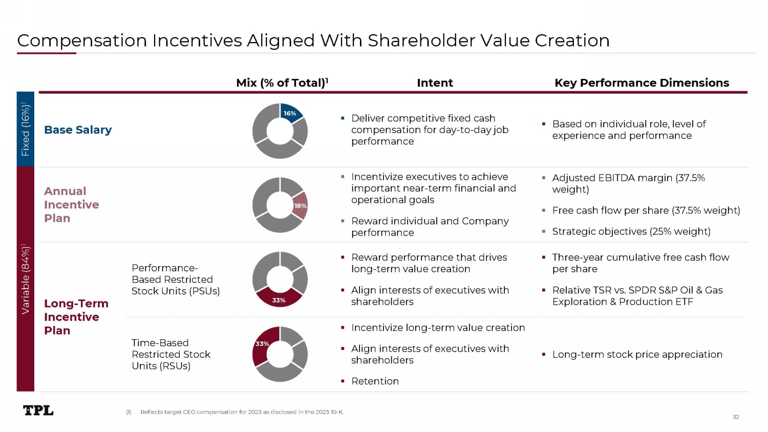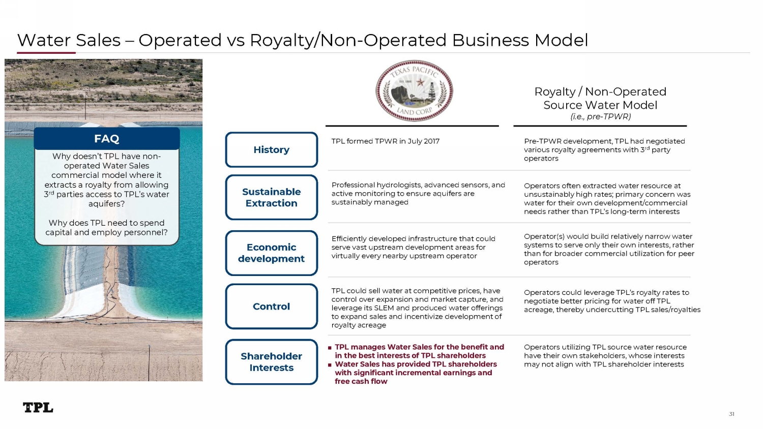 Why doesn’t TPL have non - operated Water Sales commercial model where it extracts a royalty from allowing 3 rd parties access to TPL’s water aquifers? Why does TPL need to spend capital and employ personnel? Water Sales – Operated vs Royalty/Non - Operated Business Model S u s t a in a b le Extraction Economic d e v el o p m ent Control S h a reh o ld er Interests Royalty / Non - Operated Source Water Model (i.e., pre - TPWR) Professional hydrologists, advanced sensors, and active monitoring to ensure aquifers are sustainably managed H is t o ry TPL formed TPWR in July 2017 Pre - TPWR development, TPL had negotiated various royalty agreements with 3 rd party operators Operators often extracted water resource at unsustainably high rates; primary concern was water for their own development/commercial needs rather than TPL’s long - term interests Efficiently developed infrastructure that could serve vast upstream development areas for virtually every nearby upstream operator Operator(s) would build relatively narrow water systems to serve only their own interests, rather than for broader commercial utilization for peer operators TPL could sell water at competitive prices, have control over expansion and market capture, and leverage its SLEM and produced water offerings to expand sales and incentivize development of royalty acreage Operators could leverage TPL’s royalty rates to negotiate better pricing for water off TPL acreage, thereby undercutting TPL sales/royalties ■ TPL manages Water Sales for the benefit and in the best interests of TPL shareholders ■ Water Sales has provided TPL shareholders with significant incremental earnings and free cash flow Operators utilizing TPL source water resource have their own stakeholders, whose interests may not align with TPL shareholder interests FA Q 31