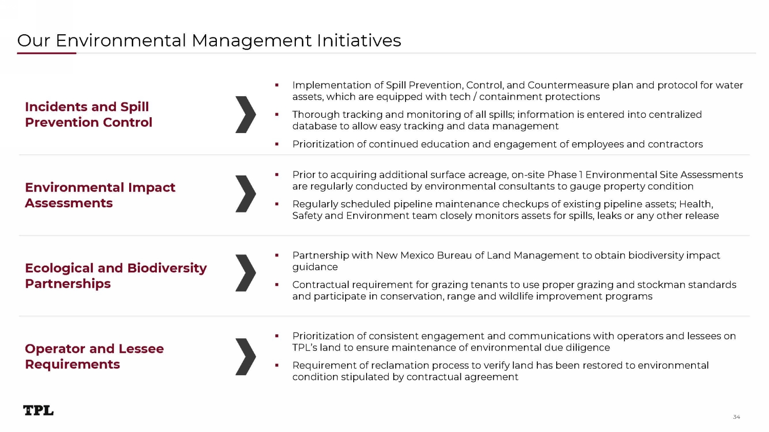Sustainability is Embedded in Our Strategy 33 Key Opportunities Carbon Management ▪ Government policies incentivize sustainable energy projects (e.g., carbon capture, utilization and storage) and TPL can reposition its business to take advantage of the opportunities created by these policies Water Management ▪ Water recycling capabilities allow operators to minimize freshwater usage; ongoing water asset electrification can reduce diesel reliance and manage emissions profile Environmental Management ▪ Adoption of new technology can reduce our costs and environmental impact ▪ Allowance of easements on land to construct electricity infrastructure supports emissions reductions from our land operators Renewable Development ▪ Expanding efforts to encourage wind and solar development on our surface and exploring all options to increase our existing renewable footprint Investing in Our People ▪ Comprehensive, job - specific training and development opportunities; high employee retention and low turnover rates, with annual employee satisfaction surveys ▪ Demonstrated commitment to enhancing diversity - 41% of workforce are women and continual assessment of organizational dynamics to cultivate a more inclusive workforce