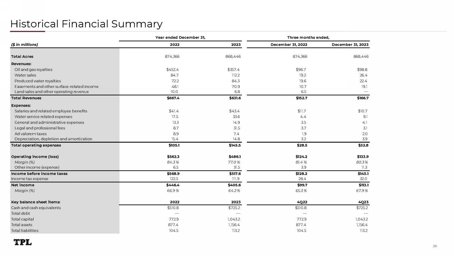 Historical Financial Summary Year ended December 31, Three months ended, ($ in millions) 2022 2 0 23 December 31, 2022 December 31, 2023 Total Acres 874,366 8 6 8 , 44 6 874,366 8 6 8 , 44 6 Revenues: Oil and gas royalties $452.4 $ 3 5 7 . 4 $96.7 $ 9 8 . 8 Water sales 84.7 11 2 . 2 19.2 2 6 . 4 Produced water royalties 72.2 8 4 . 3 19.6 22 . 4 Easements and other surface - related income 48.1 70 . 9 10.7 1 9 . 1 Land sales and other operating revenue 10.0 6 . 8 6.5 — Total Revenues $667.4 $6 3 1 .6 $152.7 $ 1 66 . 7 Expenses: Salaries and related employee benefits $41.4 $ 4 3 . 4 $11.7 $ 1 0 . 7 Water service related expenses 17.5 33 . 6 4.4 9 . 1 General and administrative expenses 13.3 1 4 . 9 3.5 4 .1 Legal and professional fees 8.7 3 1 . 5 3.7 3 . 1 Ad valorem taxes 8.9 7 .4 1.9 2 . 0 Depreciation, depletion and amortization 15.4 1 4 . 8 3.2 3 . 9 Total operating expenses $105.1 $ 1 4 5 .5 $28.5 $ 32 .8 Operating income (loss) $562.3 $ 4 8 6 .1 $124.2 $ 1 33 . 9 Margin (%) 84.3 % 77.0 % 81.4 % 80.3 % Other income (expense) 6.5 3 1 . 5 3.9 11 . 3 Income before income taxes $568.9 $ 5 1 7 .6 $128.2 $ 1 4 5 .1 Income tax expense 122.5 111 . 9 28.4 3 2 . 0 Net income $446.4 $ 4 0 5 .6 $99.7 $ 11 3 . 1 Margin (%) 66.9 % 64.2 % 65.3 % 67.9 % Key balance sheet items: 2022 2 0 23 4Q22 4Q 2 3 Cash and cash equivalents $510.8 $ 7 25 . 2 $510.8 $ 7 25 . 2 Total debt — — — — Total capital 772.9 1 , 04 3 .2 772.9 1 , 04 3 .2 Total assets 877.4 1 , 1 5 6 .4 877.4 1 , 1 5 6 .4 Total liabilities 104.5 11 3 . 2 104.5 11 3 . 2 38