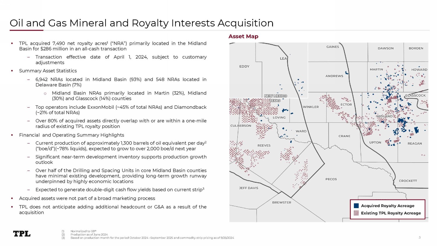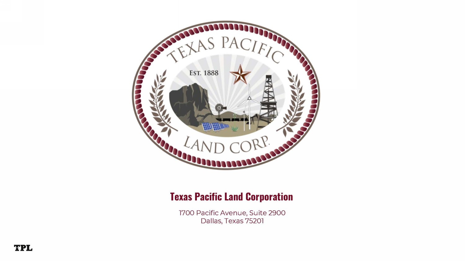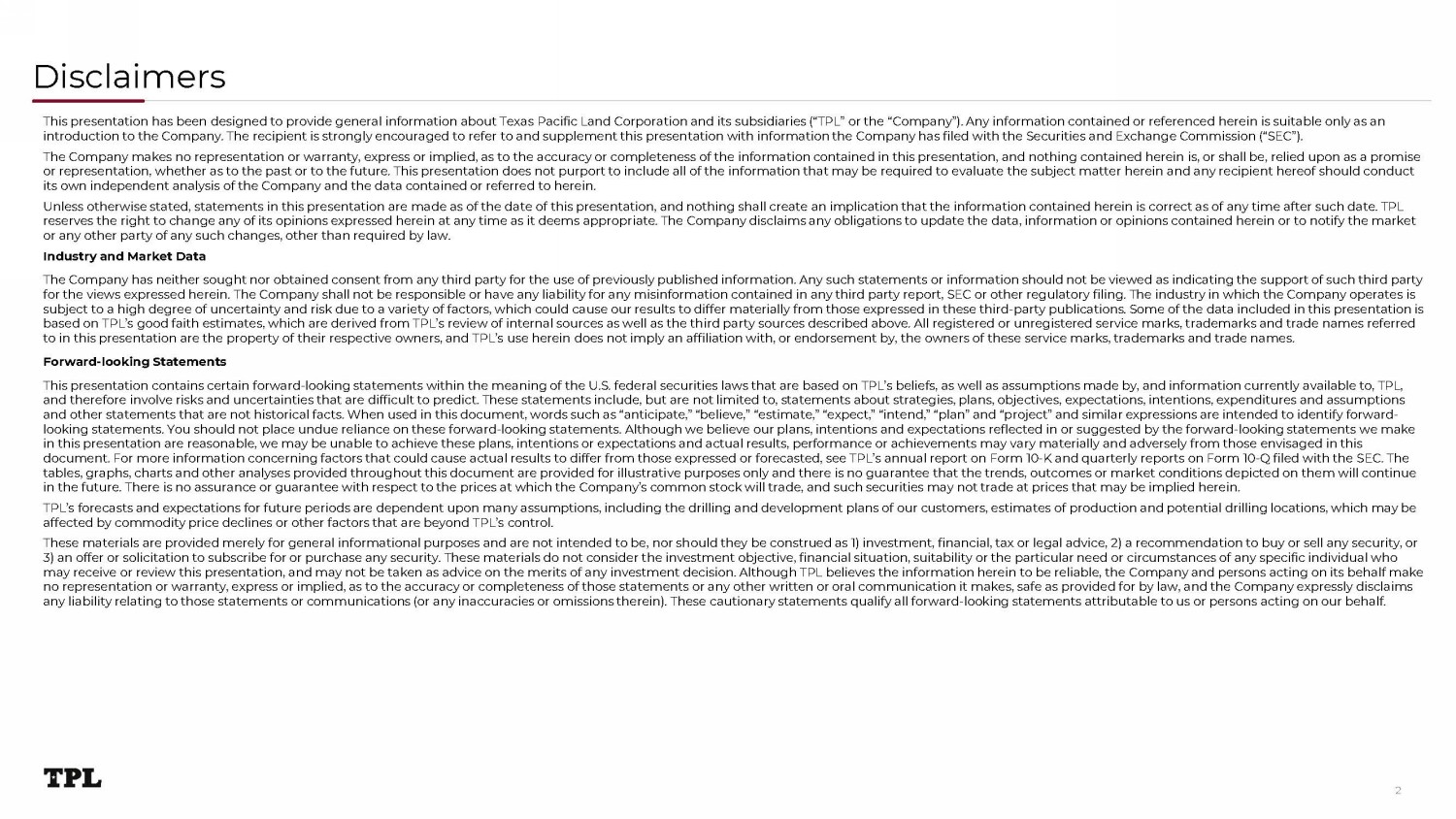 Disclaimers This presentation has been designed to provide general information about Texas Pacific Land Corporation and its subsidiaries (“T PL” or the “Company”). Any information contained or referenced herein is suitable only as an introduction to the Company. The recipient is strongly encouraged to refer to and supplement this presentation with informati on the Company has filed with the Securities and Exchange Commission (“SEC”). The Company makes no representation or warranty, express or implied, as to the accuracy or completeness of the information co nta ined in this presentation, and nothing contained herein is, or shall be, relied upon as a promise or representation, whether as to the past or to the future. This presentation does not purport to include all of the informat ion that may be required to evaluate the subject matter herein and any recipient hereof should conduct its own independent analysis of the Company and the data contained or referred to herein. Unless otherwise stated, statements in this presentation are made as of the date of this presentation, and nothing shall crea te an implication that the information contained herein is correct as of any time after such date. TPL reserves the right to change any of its opinions expressed herein at any time as it deems appropriate. The Company disclaims any obligations to update the data, information or opinions contained herein or to notify the market or any other party of any such changes, other than required by law. Industry and Market Data The Company has neither sought nor obtained consent from any third party for the use of previously published information. Any su ch statements or information should not be viewed as indicating the support of such third party for the views expressed herein. The Company shall not be responsible or have any liability for any misinformation contained i n a ny third party report, SEC or other regulatory filing. The industry in which the Company operates is subject to a high degree of uncertainty and risk due to a variety of factors, which could cause our results to differ materia lly from those expressed in these third - party publications. Some of the data included in this presentation is based on TPL’s good faith estimates, which are derived from TPL’s review of internal sources as well as the third party sourc es described above. All registered or unregistered service marks, trademarks and trade names referred to in this presentation are the property of their respective owners, and TPL’s use herein does not imply an affiliation with, or endorsement by, the owners of these service marks, trademarks and trade names. Forward - looking Statements This presentation contains certain forward - looking statements within the meaning of the U.S. federal securities laws that are ba sed on TPL’s beliefs, as well as assumptions made by, and information currently available to, TPL, and therefore involve risks and uncertainties that are difficult to predict. These statements include, but are not limited to , s tatements about strategies, plans, objectives, expectations, intentions, expenditures and assumptions and other statements that are not historical facts. When used in this document, words such as “anticipate,” “believe,” “estim ate ,” “expect,” “intend,” “plan” and “project” and similar expressions are intended to identify forward - looking statements. You should not place undue reliance on these forward - looking statements. Although we believe our plans, inte ntions and expectations reflected in or suggested by the forward - looking statements we make in this presentation are reasonable, we may be unable to achieve these plans, intentions or expectations and actual results, per formance or achievements may vary materially and adversely from those envisaged in this document. For more information concerning factors that could cause actual results to differ from those expressed or forecaste d, see TPL’s annual report on Form 10 - K and quarterly reports on Form 10 - Q filed with the SEC. The tables, graphs, charts and other analyses provided throughout this document are provided for illustrative purposes only and t her e is no guarantee that the trends, outcomes or market conditions depicted on them will continue in the future. There is no assurance or guarantee with respect to the prices at which the Company’s common stock will trade, and such securities may not trade at prices that may be implied herein. TPL’s forecasts and expectations for future periods are dependent upon many assumptions, including the drilling and developme nt plans of our customers, estimates of production and potential drilling locations, which may be affected by commodity price declines or other factors that are beyond TPL’s control. These materials are provided merely for general informational purposes and are not intended to be, nor should they be constru ed as 1) investment, financial, tax or legal advice, 2) a recommendation to buy or sell any security, or 3) an offer or solicitation to subscribe for or purchase any security. These materials do not consider the investment objecti ve, financial situation, suitability or the particular need or circumstances of any specific individual who may receive or review this presentation, and may not be taken as advice on the merits of any investment decision. Although TP L b elieves the information herein to be reliable, the Company and persons acting on its behalf make no representation or warranty, express or implied, as to the accuracy or completeness of those statements or any other writte n o r oral communication it makes, safe as provided for by law, and the Company expressly disclaims any liability relating to those statements or communications (or any inaccuracies or omissions therein). These cautionary sta tem ents qualify all forward - looking statements attributable to us or persons acting on our behalf. 2