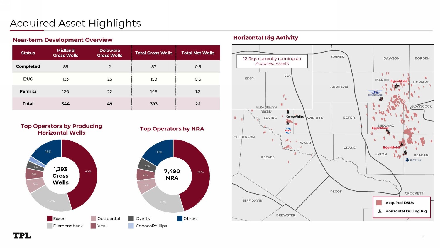 Oil and Gas Mineral and Royalty Interests Acquisition 3 ▪ TPL acquired 7 , 490 net royalty acres 1 (“NRA”) primarily located in the Midland Basin for $ 286 million in an all - cash transaction – Transaction effective date of April 1 , 2024 , subject to customary adjustments ▪ Summary Asset Statistics – 6 , 942 NRAs located in Midland Basin ( 93 % ) and 548 NRAs located in Delaware Basin ( 7 % ) o Midland Basin NRAs primarily located in Martin ( 32 % ), Midland ( 30 % ) and Glasscock ( 14 % ) counties – Top operators include ExxonMobil (~ 45 % of total NRAs) and Diamondback (~ 21 % of total NRAs) – Over 80 % of acquired assets directly overlap with or are within a one - mile radius of existing TPL royalty position ▪ Financial and Operating Summary Highlights – Current production of approximately 1 , 300 barrels of oil equivalent per day 2 (“boe/d”)(~ 78 % liquids), expected to grow to over 2 , 000 boe/d next year – Significant near - term development inventory supports production growth outlook – Over half of the Drilling and Spacing Units in core Midland Basin counties have minimal existing development, providing long - term growth runway underpinned by highly economic locations – Expected to generate double - digit cash flow yields based on current strip 3 ▪ Acquired assets were not part of a broad marketing process ▪ TPL does not anticipate adding additional headcount or G&A as a result of the acquisition (1) Normalized to 1/8 th (2) Production as of June 2024 (3) Based on production month for the period October 2024 – September 2025 and commodity strip pricing as of 9/25/2024 Asset Map
