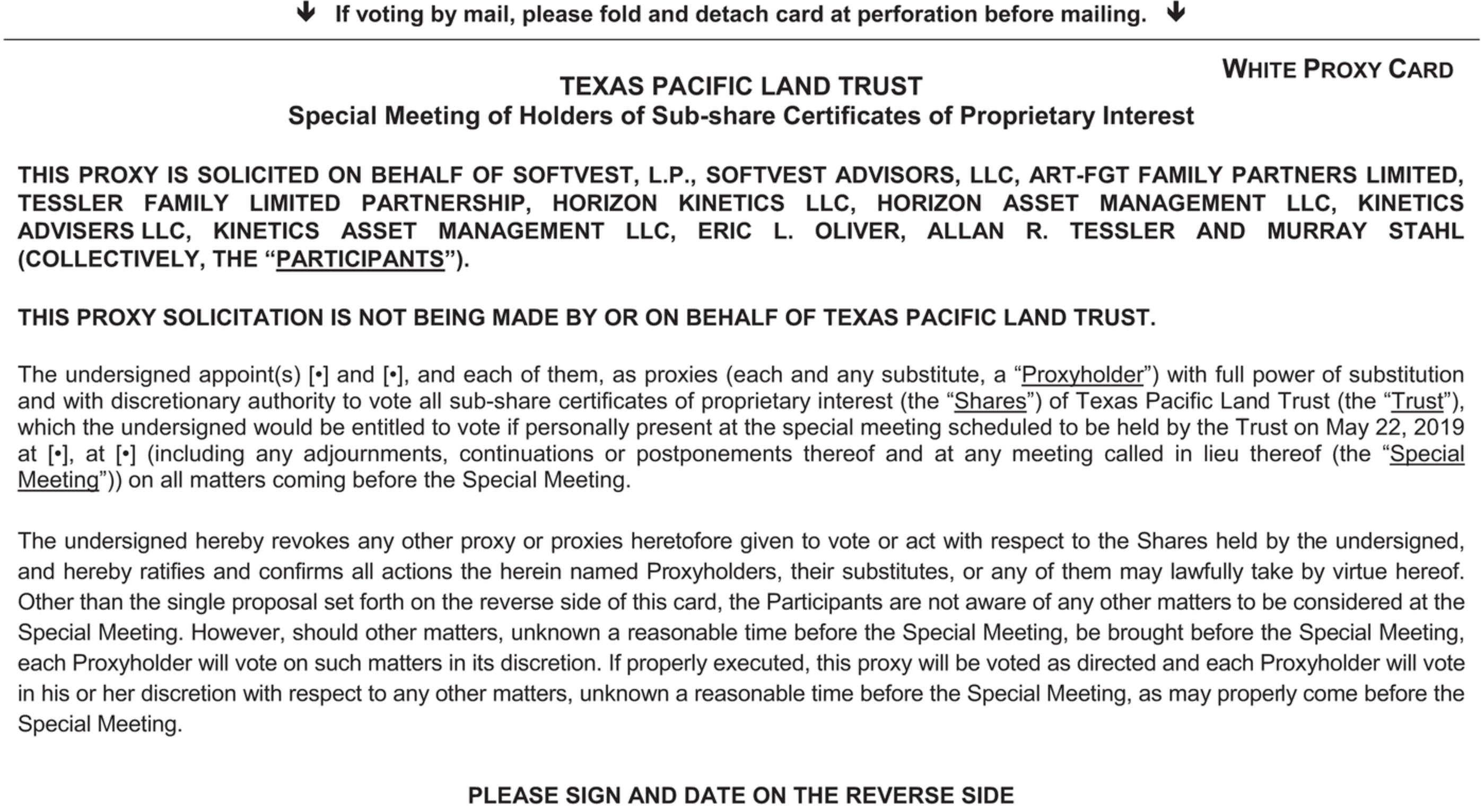 SoftVest, L.P. (SoftVest LP) is furnishing this proxy statement (this Proxy Statement) to holders of sub-share certificates of proprietary interest (the Shares), of Texas Pacific Land Trust (the Trust), in connection with SoftVest LPs solicitation of proxies for use at the special meeting of holders of Shares scheduled to be held on May 22, 2019 at 10:00 a.m., Dallas time, at [•], Dallas, Texas for the election of a new trustee of the Trust to fill the vacancy created by the resignation of Maurice Meyer III (such meeting, together with any adjournments, continuations or postponements thereof, and any meeting called in lieu thereof, the Special Meeting).
