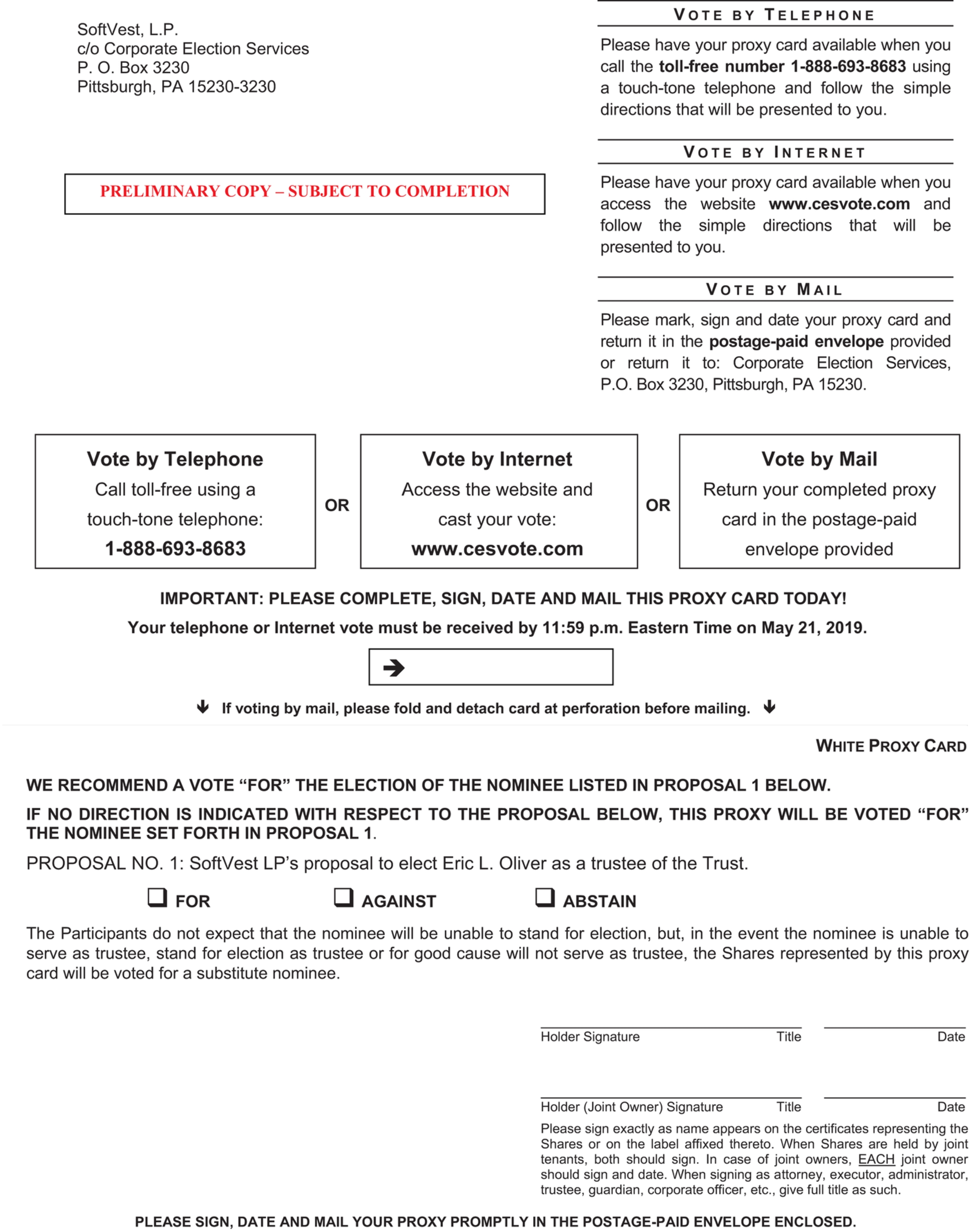 If your Shares are held in the name of a brokerage firm, bank or other custodian, only that firm can vote such Shares and, with respect to the election of a trustee, only upon receipt of your specific instruction. Accordingly, we urge you to contact the person responsible for your account and instruct that person to execute the WHITE proxy card on your behalf. Please follow any voting instructions provided by your bank, brokerage firm, dealer, trust company or other nominee.