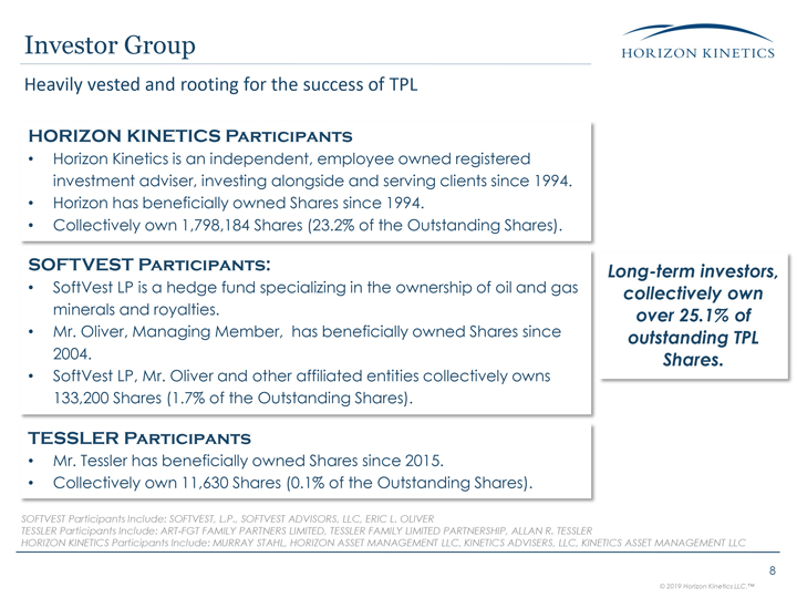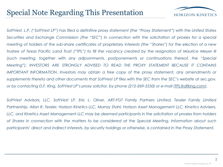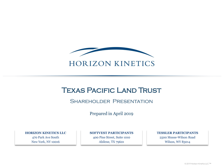 SoftVest LP on April 23, 2019 and (iii) a presentation made available by SoftVest LP on April 23, 2019. The video is available at https://horizonkinetics.com/tpl/.