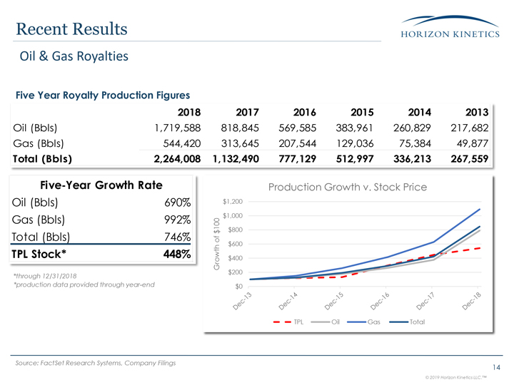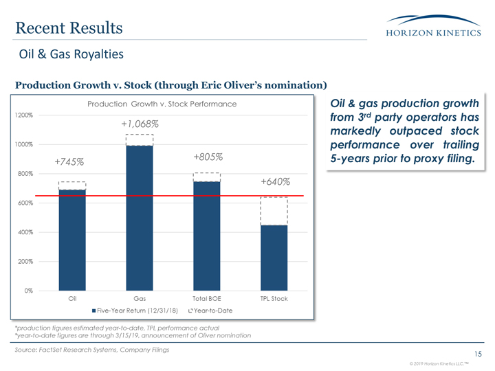 (through Eric Oliver’s nomination) *production figures estimated year-to-date, TPL performance actual *year-to-date figures are through 3/15/19, announcement of Oliver nomination +745% +1,068% +805% +640% Oil & Gas