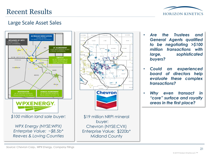 sale buyer: WPX Energy (NYSE:WPX)Enterprise Value: ~$8.5b* Reeves & Loving Counties $19 million NRPI mineral buyer: Chevron (NYSE:CVX)Enterprise Value: $220b* Midland County Large Scale Asset Sales Are the Trustees and General