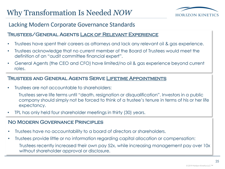 Modern Governance PrinciplesTrustees have no accountability to a board of directors or shareholders.Trustees provide little or no information regarding capital allocation or compensation:Trustees recently increased their own pay 52x,