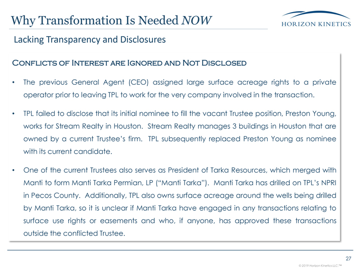 previous General Agent (CEO) assigned large surface acreage rights to a private operator prior to leaving TPL to work for the very company involved in the transaction.TPL failed to disclose that its initial nominee to fill the vacant