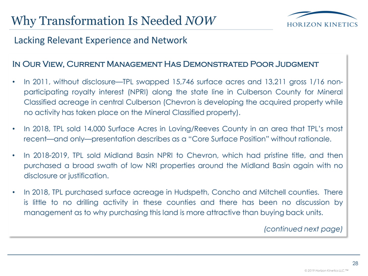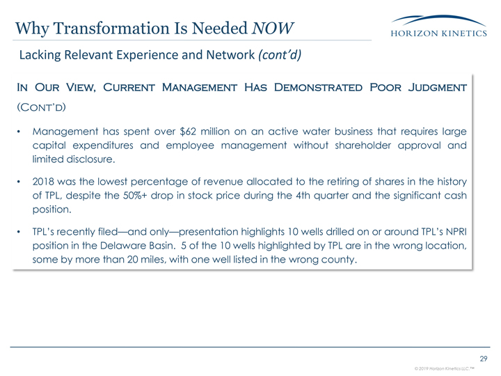 around TPL’s NPRI position in the Delaware Basin. 5 of the 10 wells highlighted by TPL are in the wrong location, some by more than 20 miles, with one well listed in the wrong county. Lacking Relevant Experience and Network (cont’d)