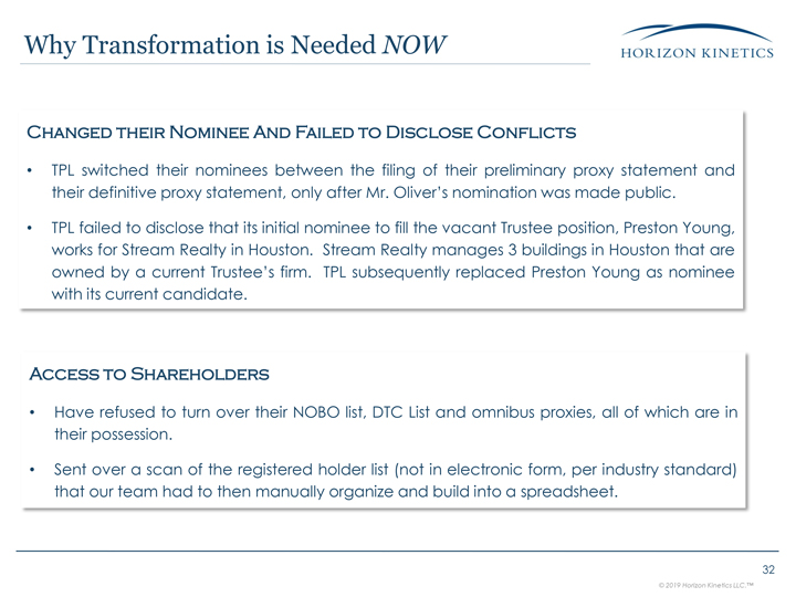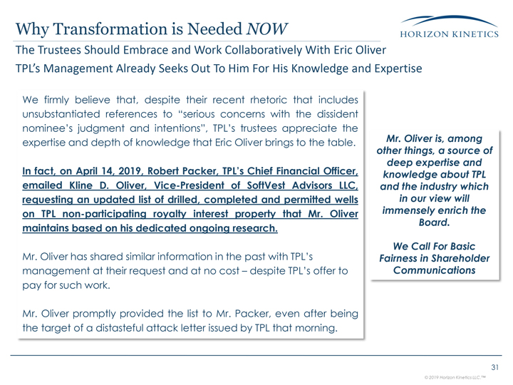 Oliver TPL’s Management Already Seeks Out To Him For His Knowledge and Expertise 31 We firmly believe that, despite their recent rhetoric that includes unsubstantiated references to “serious concerns with the dissident nominee’s