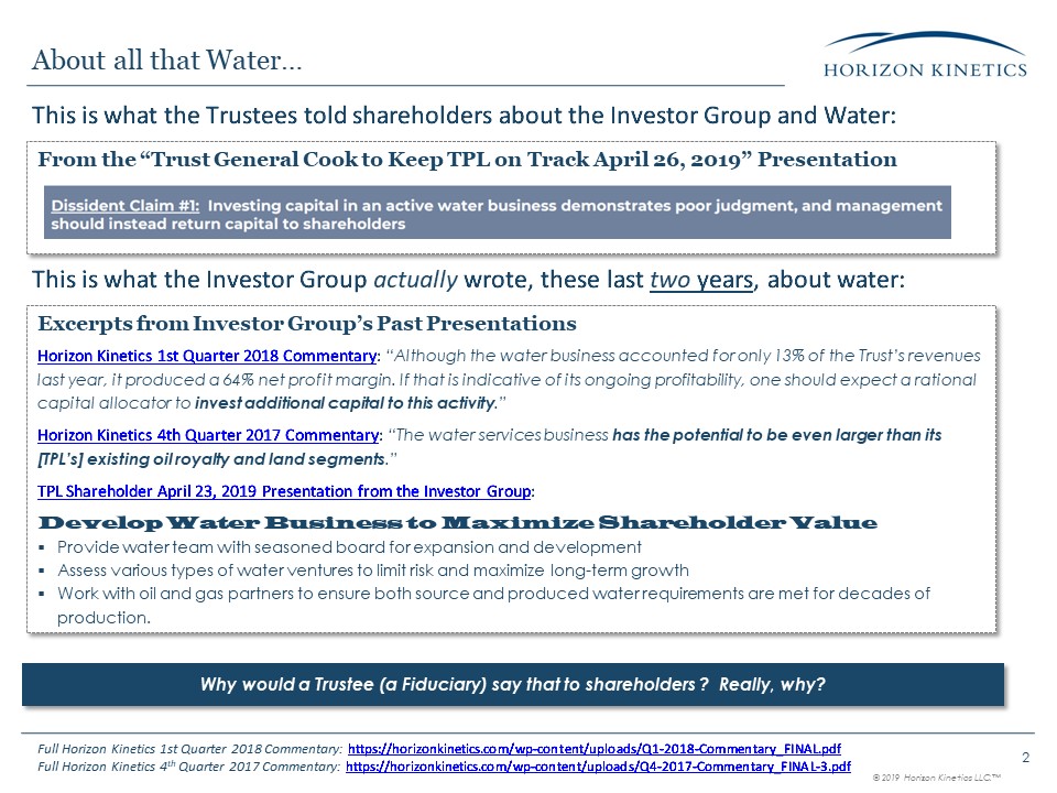 Water… This is what the Trustees told shareholders about the Investor Group and Water: 2 Excerpts from Investor Group’s Past PresentationsHorizon Kinetics 1st Quarter 2018 Commentary: “Although the water business accounted for only 13%