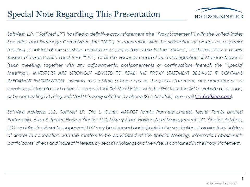 filed a definitive proxy statement (the “Proxy Statement”) with the United States Securities and Exchange Commission (the “SEC”) in connection with the solicitation of proxies for a special meeting of holders of the sub-share certificates of proprietary interests (the “Shares”) for the election of a new trustee of Texas Pacific Land Trust (“TPL”) to fill the