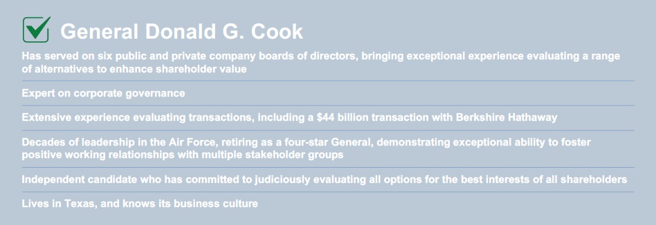 Based on feedback we received from our shareholders, who sought a nominee with extensive leadership and public company board experience, we have given considerable time and thought to identifying the most qualified new Trustee for TPL. We considered more than 15 candidates for the position, and General Cook stood head and shoulders above the rest.