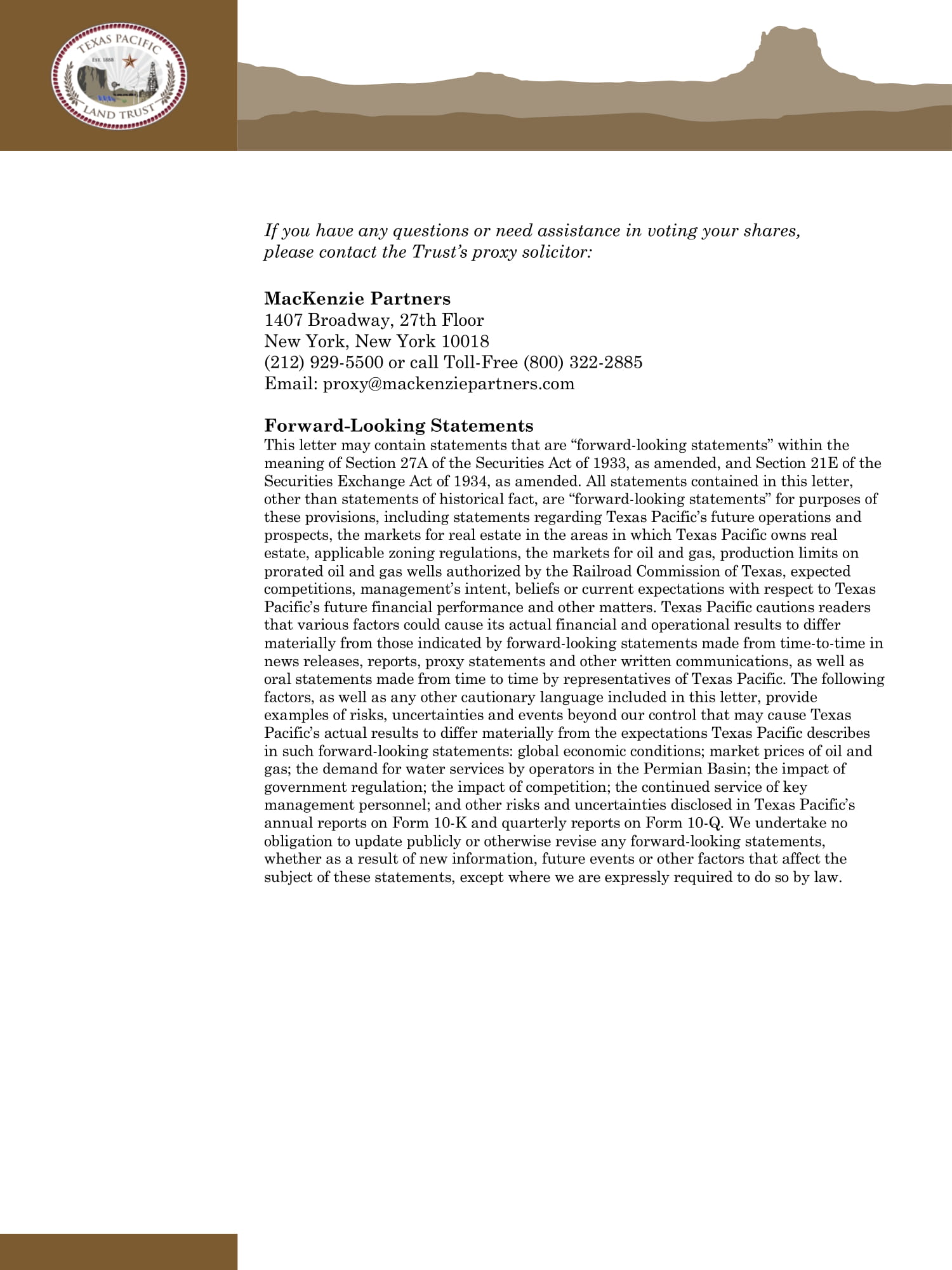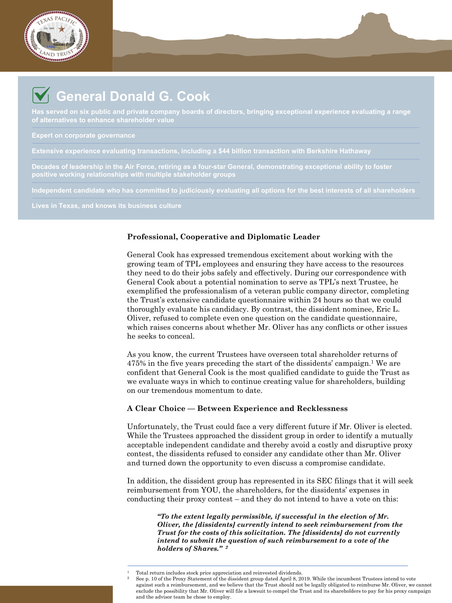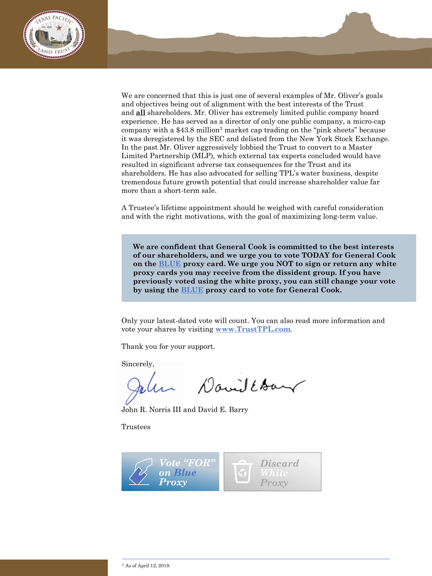 DALLAS (April 15, 2019) – The Board of Trustees of Texas Pacific Land Trust (NYSE: TPL) (the “Trust”) today sent a letter to shareholders providing further information about the skills and experience of General Donald “Don” G. Cook, the Trust’s candidate for election as a Trustee at the Special Meeting scheduled for May 22, 2019. The Trustees believe that shareholders will benefit from General Cook’s extensive public company board experience, his expertise in corporate governance and his leadership capabilities, which will enhance the Trust and its ability to continue delivering exceptional shareholder value. The Trust urges its shareholders to vote FOR General Cook by using the BLUE proxy card.