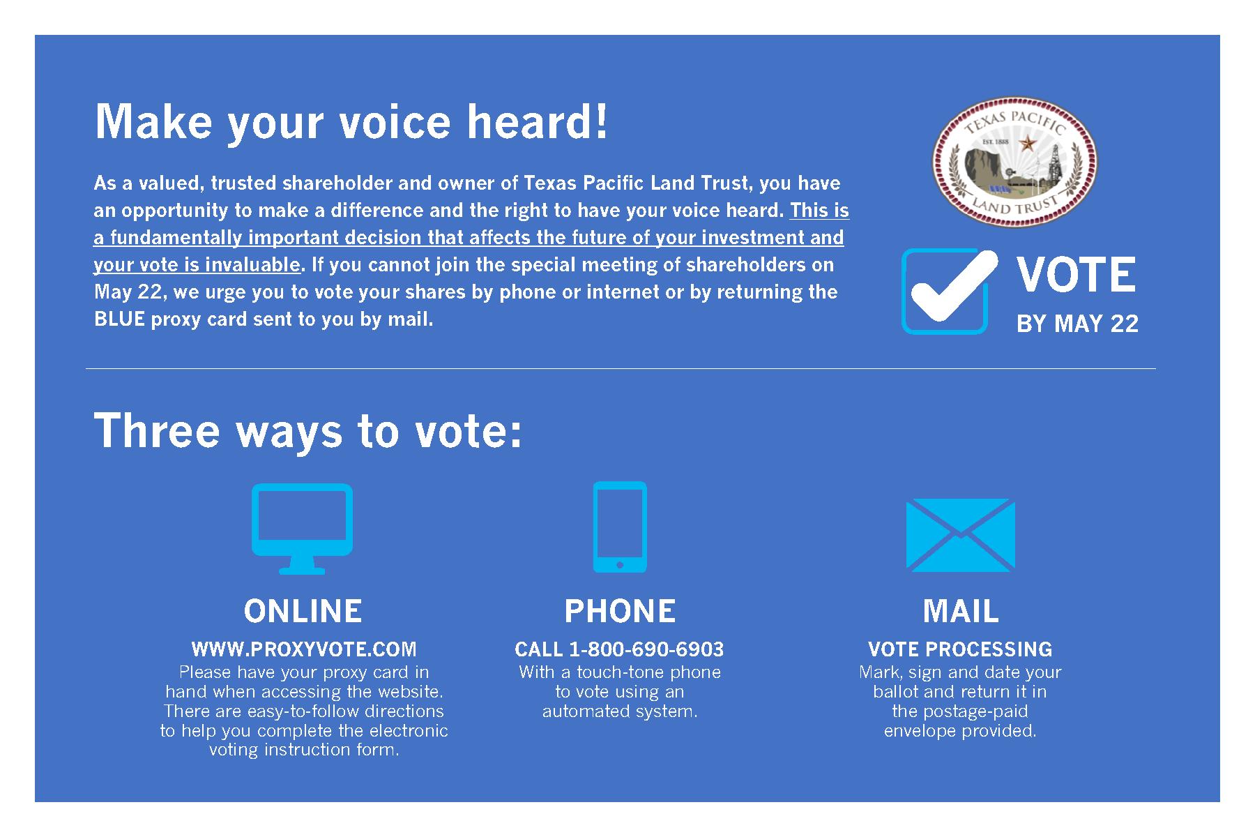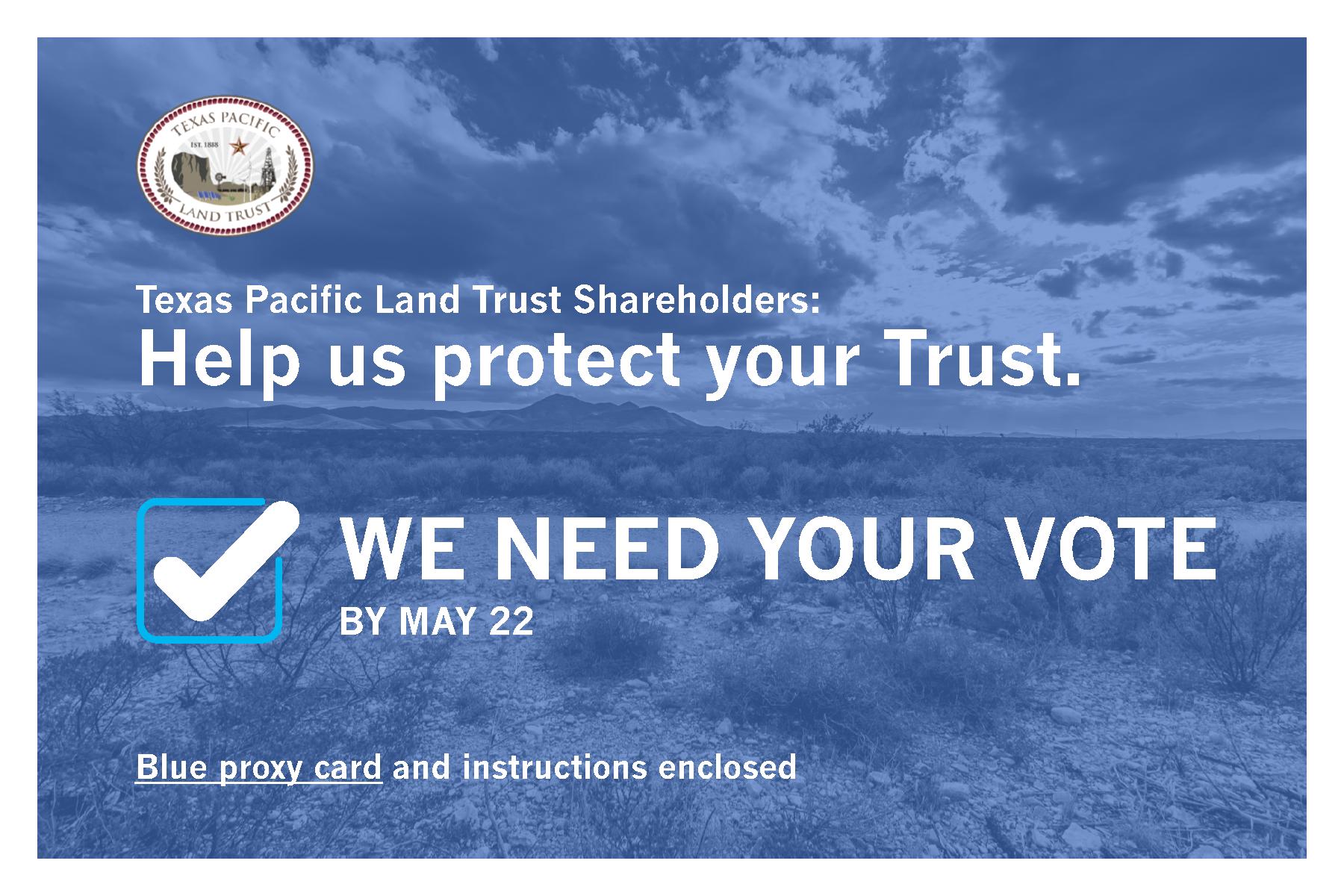 Over the past few weeks, you have received many communications about the upcoming election at Texas Pacific Land Trust. We will be direct: Your vote on the BLUE proxy card is critical to protect your TPL investment.