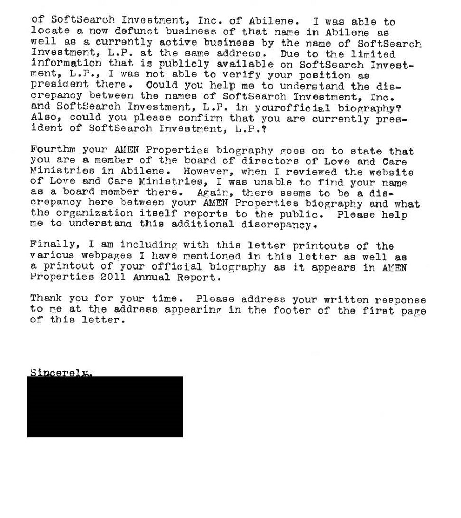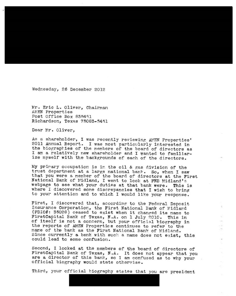| 1. | In the quarterly and annual reports of AMEN Properties, LLC (“AMEN”), you are described as serving on the board of the “First National Bank of Midland.” We have been unable to confirm that any such bank exists. A shareholder of AMEN pointed this out to you in a letter as early as 2012 (the letter is attached hereto as Exhibit A) and asked you to explain also several other contradictions in your resume. Please provide an explanation of these discrepancies. |