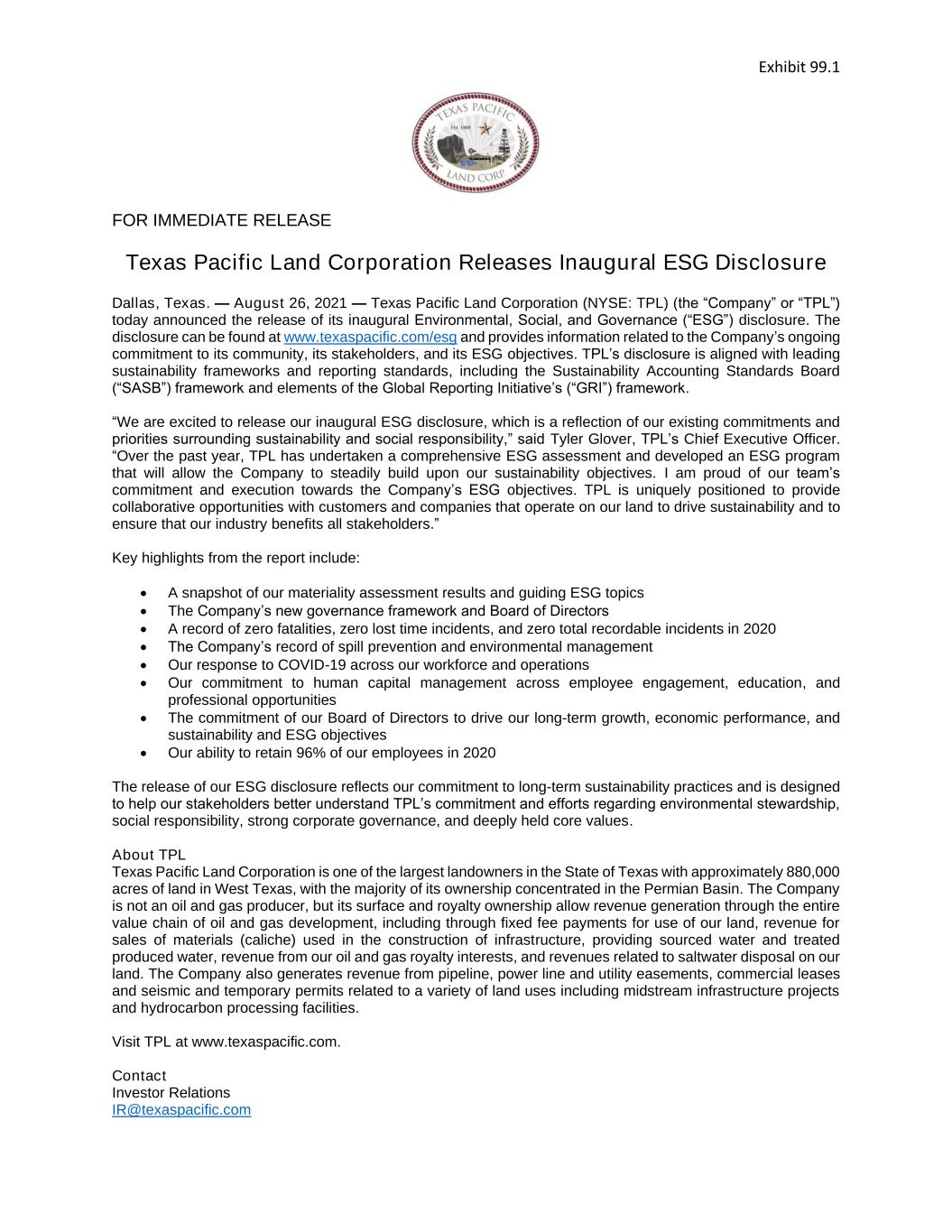 Exhibit 99.1 FOR IMMEDIATE RELEASE Texas Pacific Land Corporation Releases Inaugural ESG Disclosure Dallas, Texas. — August 26, 2021 — Texas Pacific Land Corporation (NYSE: TPL) (the “Company” or “TPL”) today announced the release of its inaugural Environmental, Social, and Governance (“ESG”) disclosure. The disclosure can be found at www.texaspacific.com/esg and provides information related to the Company’s ongoing commitment to its community, its stakeholders, and its ESG objectives. TPL’s disclosure is aligned with leading sustainability frameworks and reporting standards, including the Sustainability Accounting Standards Board (“SASB”) framework and elements of the Global Reporting Initiative’s (“GRI”) framework. “We are excited to release our inaugural ESG disclosure, which is a reflection of our existing commitments and priorities surrounding sustainability and social responsibility,” said Tyler Glover, TPL’s Chief Executive Officer. “Over the past year, TPL has undertaken a comprehensive ESG assessment and developed an ESG program that will allow the Company to steadily build upon our sustainability objectives. I am proud of our team’s commitment and execution towards the Company’s ESG objectives. TPL is uniquely positioned to provide collaborative opportunities with customers and companies that operate on our land to drive sustainability and to ensure that our industry benefits all stakeholders.” Key highlights from the report include: • A snapshot of our materiality assessment results and guiding ESG topics • The Company’s new governance framework and Board of Directors • A record of zero fatalities, zero lost time incidents, and zero total recordable incidents in 2020 • The Company’s record of spill prevention and environmental management • Our response to COVID-19 across our workforce and operations • Our commitment to human capital management across employee engagement, education, and professional opportunities • The commitment of our Board of Directors to drive our long-term growth, economic performance, and sustainability and ESG objectives • Our ability to retain 96% of our employees in 2020 The release of our ESG disclosure reflects our commitment to long-term sustainability practices and is designed to help our stakeholders better understand TPL’s commitment and efforts regarding environmental stewardship, social responsibility, strong corporate governance, and deeply held core values. About TPL Texas Pacific Land Corporation is one of the largest landowners in the State of Texas with approximately 880,000 acres of land in West Texas, with the majority of its ownership concentrated in the Permian Basin. The Company is not an oil and gas producer, but its surface and royalty ownership allow revenue generation through the entire value chain of oil and gas development, including through fixed fee payments for use of our land, revenue for sales of materials (caliche) used in the construction of infrastructure, providing sourced water and treated produced water, revenue from our oil and gas royalty interests, and revenues related to saltwater disposal on our land. The Company also generates revenue from pipeline, power line and utility easements, commercial leases and seismic and temporary permits related to a variety of land uses including midstream infrastructure projects and hydrocarbon processing facilities. Visit TPL at www.texaspacific.com. Contact Investor Relations IR@texaspacific.com