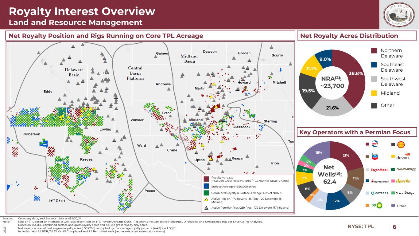 | 5NYSE: TPL 64%6% 30% Unique Exposure to Full Permian Development Chain Ownership of right of way Ownership of groundwater and subsurface injection rights High margins with no capital Surface Provides ease of access TPL Business Overview Business Flow Overview Maximize Surface Ownership to Operate Profitable Water Business that Facilitates Development of Royalty Acreage Royalties Assets located in the core of the Permian No capex or opex burden for organic production and cash flow growth Real ownership of assets underlying cash flow generation Demand for water disposal services and locations on TPL surface has significantly out-paced the rest of the Permian Water Provides operational solutions across sourcing and disposal Disposal comprises significant portion of operator LOE Royalty stream with limited capex requirements to capture additional value = Land and Resource Management = Water Services and Operations Reporting Segments: Royalties ■ TPL owns an average 4.4% revenue interest across ~533,260 gross royalty acres in the Permian Basin SLEM ■ TPL surface generates multiple income streams from Oil & Gas activities, Renewables, Grazing and Hunting leases TPWR ■ TPWR provides brackish and treated water for well completions and facilitates produced water disposal 3Q21 TPL Revenue $124mm Allows continued development Source: Company data. Water Royalties SLEM