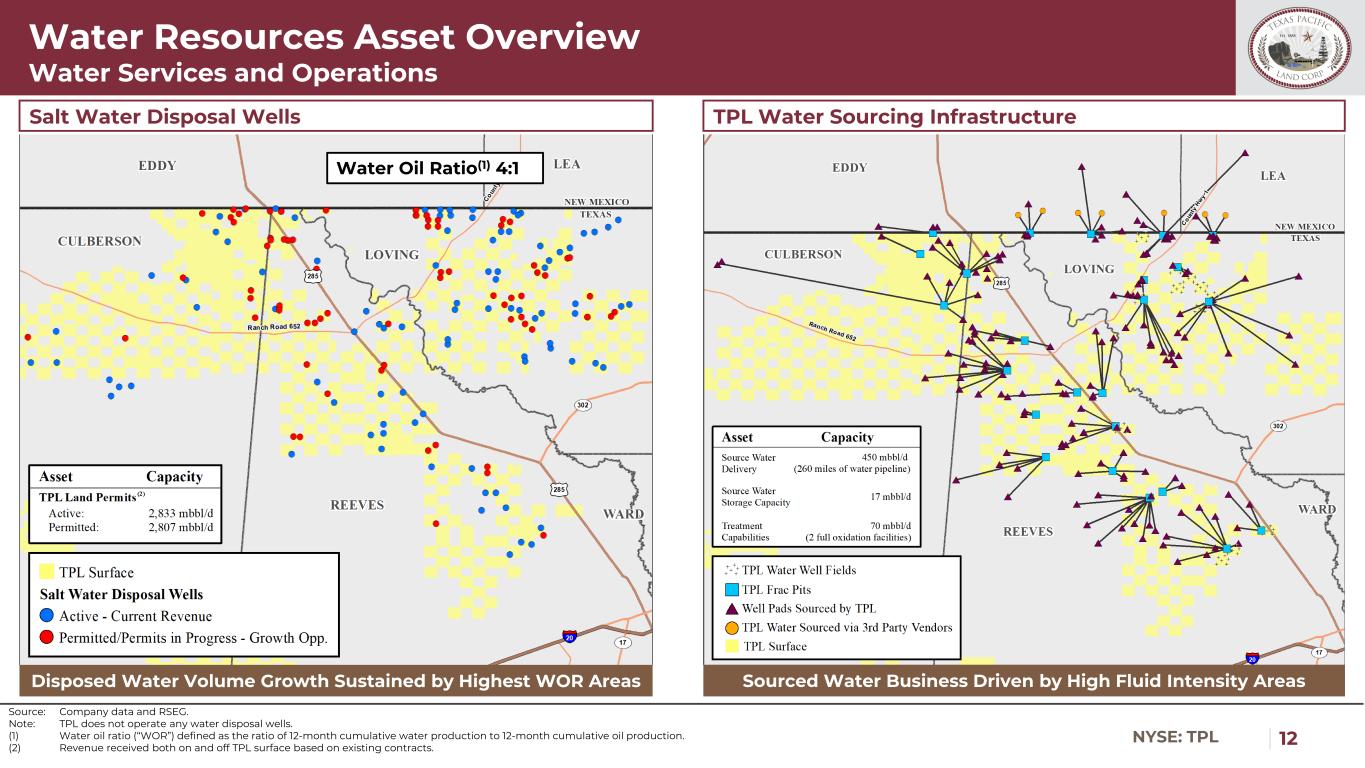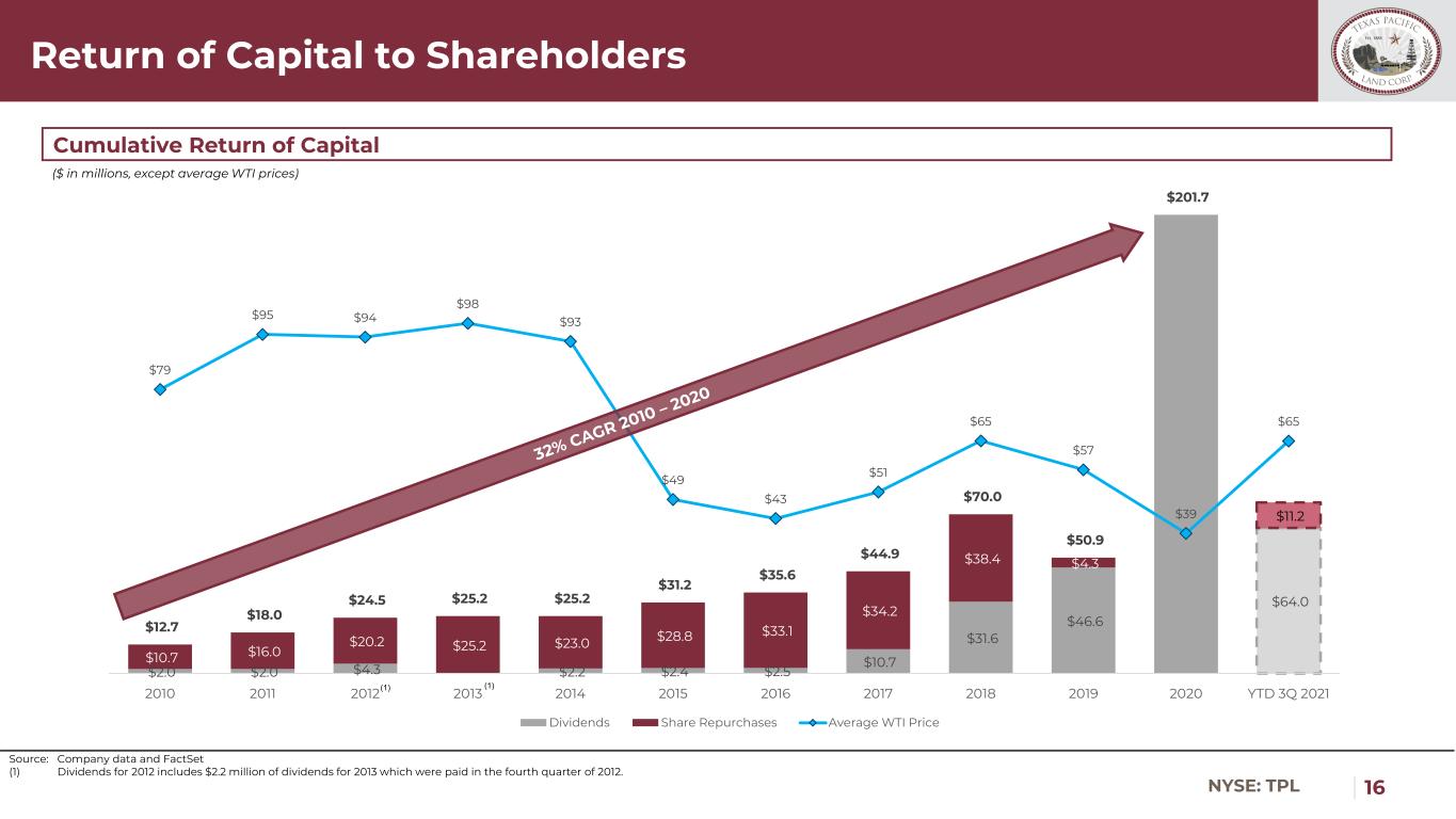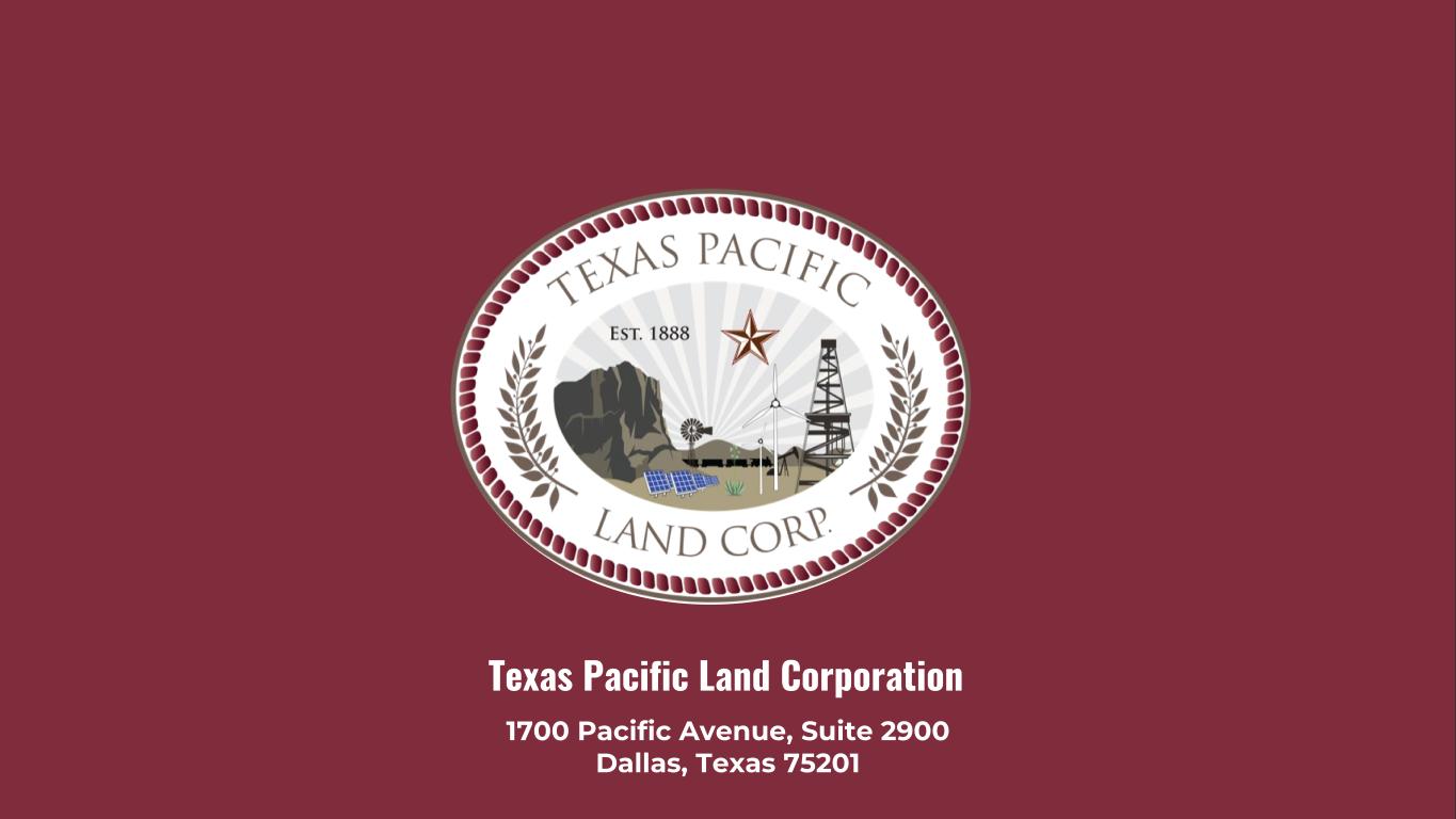 | 2NYSE: TPL This presentation has been designed to provide general information about Texas Pacific Land Corporation and its subsidiaries (“TPL” or the “Company”). Any information contained or referenced herein is suitable only as an introduction to the Company. The recipient is strongly encouraged to refer to and supplement this presentation with information the Company has filed with the Securities and Exchange Commission (“SEC”). The Company makes no representation or warranty, express or implied, as to the accuracy or completeness of the information contained in this presentation, and nothing contained herein is, or shall be, relied upon as a promise or representation, whether as to the past or to the future. This presentation does not purport to include all of the information that may be required to evaluate the subject matter herein and any recipient hereof should conduct its own independent analysis of the Company and the data contained or referred to herein. Unless otherwise stated, statements in this presentation are made as of the date of this presentation, and nothing shall create an implication that the information contained herein is correct as of any time after such date. TPL reserves the right to change any of its opinions expressed herein at any time as it deems appropriate. The Company disclaims any obligations to update the data, information or opinions contained herein or to notify the market or any other party of any such changes, other than required by law. Industry and Market Data The Company has neither sought nor obtained consent from any third party for the use of previously published information. Any such statements or information should not be viewed as indicating the support of such third party for the views expressed herein. The Company shall not be responsible or have any liability for any misinformation contained in any third party report, SEC or other regulatory filing. The industry in which the Company operates is subject to a high degree of uncertainty and risk due to a variety of factors, which could cause our results to differ materially from those expressed in these third-party publications. Some of the data included in this presentation is based on TPL’s good faith estimates, which are derived from TPL’s review of internal sources as well as the third party sources described above. All registered or unregistered service marks, trademarks and trade names referred to in this presentation are the property of their respective owners, and TPL’s use herein does not imply an affiliation with, or endorsement by, the owners of these service marks, trademarks and trade names. Forward-looking Statements This presentation contains certain forward-looking statements within the meaning of the U.S. federal securities laws that are based on TPL’s beliefs, as well as assumptions made by, and information currently available to, TPL, and therefore involve risks and uncertainties that are difficult to predict. These statements include, but are not limited to, statements about strategies, plans, objectives, expectations, intentions, expenditures and assumptions and other statements that are not historical facts. When used in this document, words such as “anticipate,” “believe,” “estimate,” “expect,” “intend,” “plan” and “project” and similar expressions are intended to identify forward-looking statements. You should not place undue reliance on these forward-looking statements. Although we believe our plans, intentions and expectations reflected in or suggested by the forward-looking statements we make in this presentation are reasonable, we may be unable to achieve these plans, intentions or expectations and actual results, performance or achievements may vary materially and adversely from those envisaged in this document. For more information concerning factors that could cause actual results to differ from those expressed or forecasted, see TPL’s annual report on Form 10-K and quarterly reports on Form 10-Q filed with the SEC. The tables, graphs, charts and other analyses provided throughout this document are provided for illustrative purposes only and there is no guarantee that the trends, outcomes or market conditions depicted on them will continue in the future. There is no assurance or guarantee with respect to the prices at which the Company’s common stock will trade, and such securities may not trade at prices that may be implied herein. TPL’s forecasts and expectations for future periods are dependent upon many assumptions, including the drilling and development plans of our customers, estimates of production and potential drilling locations, which may be affected by commodity price declines, the severity and duration of the COVID-19 pandemic and related economic repercussions or other factors that are beyond TPL’s control. These materials are provided merely for general informational purposes and are not intended to be, nor should they be construed as 1) investment, financial, tax or legal advice, 2) a recommendation to buy or sell any security, or 3) an offer or solicitation to subscribe for or purchase any security. These materials do not consider the investment objective, financial situation, suitability or the particular need or circumstances of any specific individual who may receive or review this presentation, and may not be taken as advice on the merits of any investment decision. Although TPL believes the information herein to be reliable, the Company and persons acting on its behalf make no representation or warranty, express or implied, as to the accuracy or completeness of those statements or any other written or oral communication it makes, safe as provided for by law, and the Company expressly disclaims any liability relating to those statements or communications (or any inaccuracies or omissions therein). These cautionary statements qualify all forward-looking statements attributable to us o