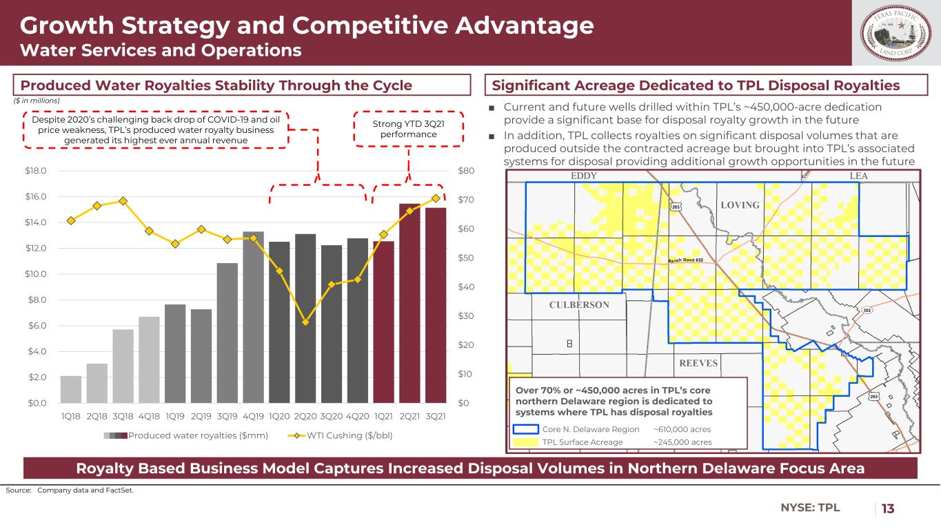 | 12NYSE: TPL Water Resources Asset Overview Water Services and Operations Source: Company data and RSEG. Note: TPL does not operate any water disposal wells. (1) Water oil ratio (“WOR”) defined as the ratio of 12-month cumulative water production to 12-month cumulative oil production. (2) Revenue received both on and off TPL surface based on existing contracts. Disposed Water Volume Growth Sustained by Highest WOR Areas Sourced Water Business Driven by High Fluid Intensity Areas UpdateSalt Water Disposal Wells TPL Water Sourcing Infrastructure Water Oil Ratio(1) 4:1