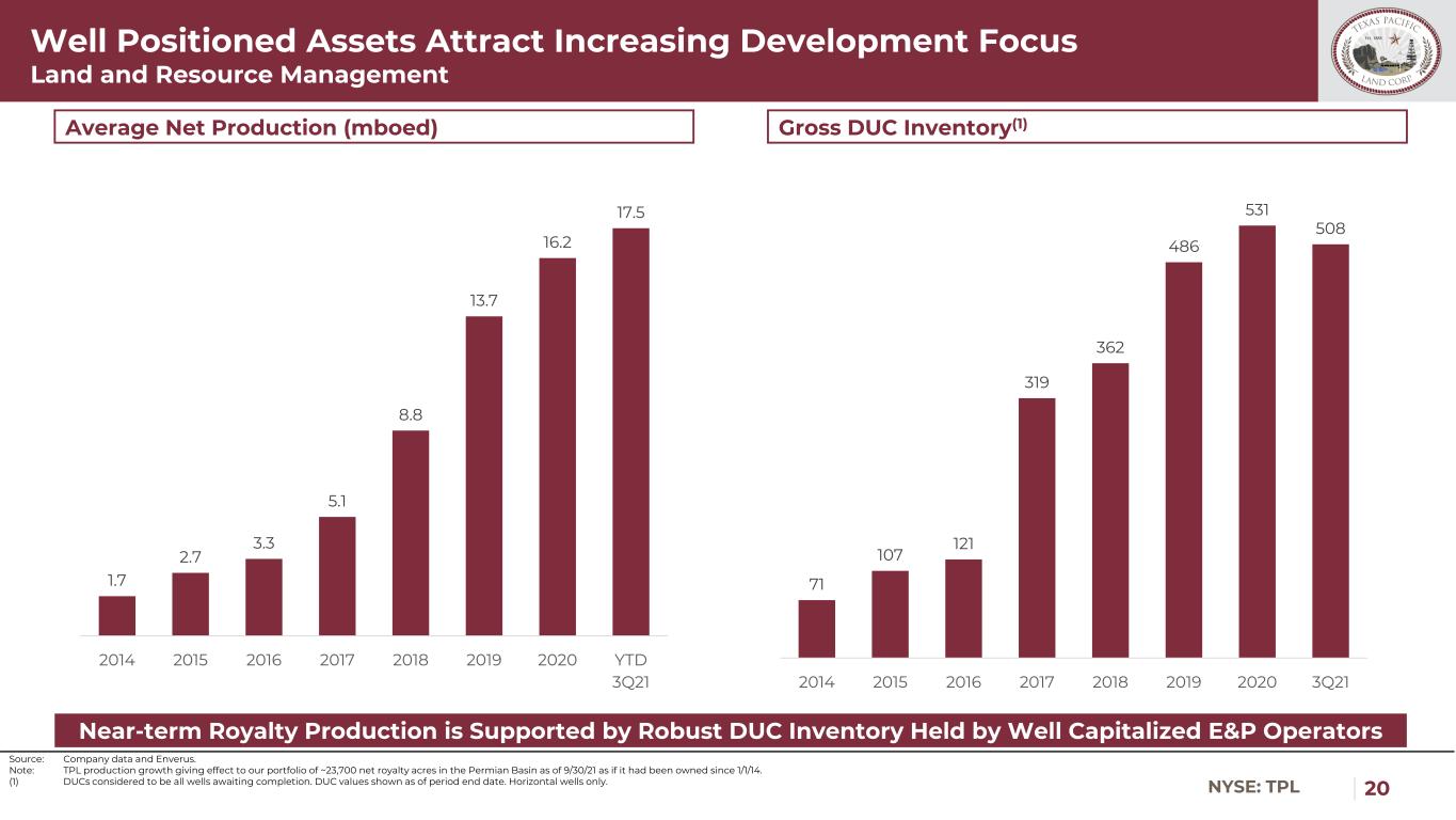 | 20NYSE: TPL Well Positioned Assets Attract Increasing Development Focus Land and Resource Management Source: Company data and Enverus. Note: TPL production growth giving effect to our portfolio of ~23,700 net royalty acres in the Permian Basin as of 9/30/21 as if it had been owned since 1/1/14. (1) DUCs considered to be all wells awaiting completion. DUC values shown as of period end date. Horizontal wells only. Average Net Production (mboed) Gross DUC Inventory(1) Near-term Royalty Production is Supported by Robust DUC Inventory Held by Well Capitalized E&P Operators 1.7 2.7 3.3 5.1 8.8 13.7 16.2 17.5 2014 2015 2016 2017 2018 2019 2020 YTD 3Q21 71 107 121 319 362 486 531 508 2014 2015 2016 2017 2018 2019 2020 3Q21