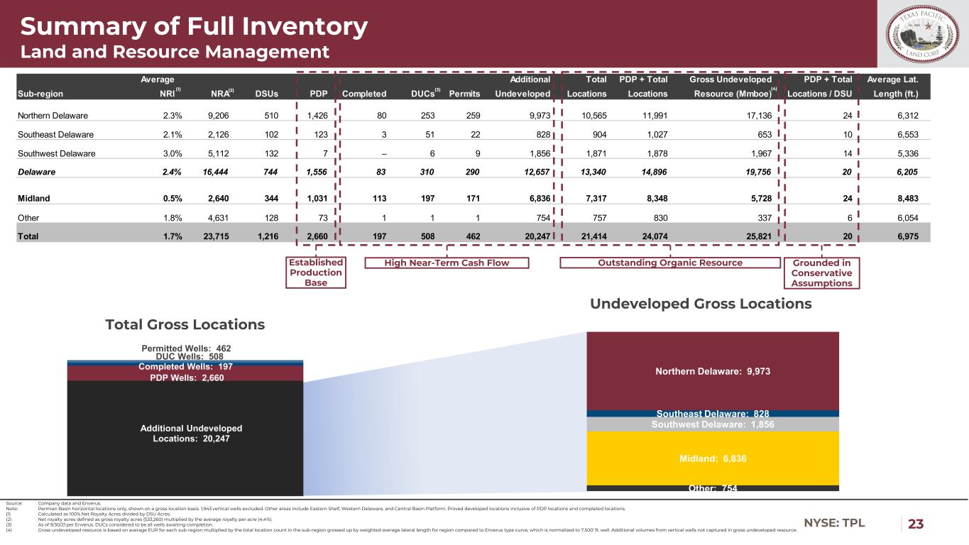| 22NYSE: TPL 68% 30% 2% 6% 7% 27% 5% 8% 13% 1% 33% 64% 21% 14% 1% 8% 14% 16% 5% 9%4% 19% 25% 76% 15% 6% 3% 3% 19% 31% 5% 6% 7% 7% 22% Summary of Highest-Visibility Inventory Land and Resource Management Source: Company data and Enverus. Note: Permian Basin horizontal locations only as of 9/30/21. (1) Permitted well conversion rate based on wells permitted from 10/1/19 through 9/30/20 and then drilled through 9/30/21. (2) DUC well conversion rate based on wells drilled from 10/1/19 through 9/30/20 and then completed through 9/30/21. (3) Completed well conversion rates based on wells completed between 10/1/19 and 9/30/20. (4) DUCs considered to be all wells awaiting completion. Highest-Visibility Inventory with Top Operators Validates TPL’s Near-Term Production Outlook Other Northern Delaware Other Midland Southeast Delaware Southwest Delaware 100% NRI Permitted Wells ~70% of Permits are drilled within 6 months(1) ~77% of Permits are drilled within 12 months(1) Permitted Wells: 7.3 100% NRI DUC Wells ~21% of DUCs are completed within 6 months(2) ~60% of DUCs are completed within 12 months(2) DUC Wells(4): 7.8 100% NRI Completed Wells ~96% of Completed Wells are listed as producing within ~1 month(3) Completed Wells: 1.9 N R I b y O p er at or N R I b y R eg io n Permitted Wells: 7.3 Completed Wells: 1.9 DUC Wells(4): 7.8