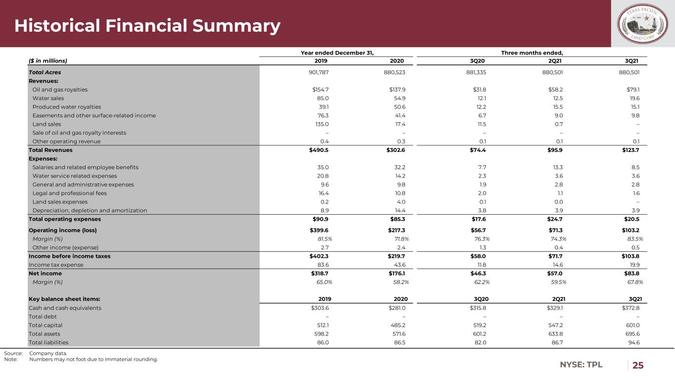 | 25NYSE: TPL Historical Financial Summary Source: Company data. Note: Numbers may not foot due to immaterial rounding. Year ended December 31, Three months ended, ($ in millions) 2019 2020 3Q20 2Q21 3Q21 Total Acres 901,787 880,523 881,335 880,501 880,501 Revenues: Oil and gas royalties $154.7 $137.9 $31.8 $58.2 $79.1 Water sales 85.0 54.9 12.1 12.5 19.6 Produced water royalties 39.1 50.6 12.2 15.5 15.1 Easements and other surface-related income 76.3 41.4 6.7 9.0 9.8 Land sales 135.0 17.4 11.5 0.7 – Sale of oil and gas royalty interests – – – – – Other operating revenue 0.4 0.3 0.1 0.1 0.1 Total Revenues $490.5 $302.6 $74.4 $95.9 $123.7 Expenses: Salaries and related employee benefits 35.0 32.2 7.7 13.3 8.5 Water service related expenses 20.8 14.2 2.3 3.6 3.6 General and administrative expenses 9.6 9.8 1.9 2.8 2.8 Legal and professional fees 16.4 10.8 2.0 1.1 1.6 Land sales expenses 0.2 4.0 0.1 0.0 – Depreciation, depletion and amortization 8.9 14.4 3.8 3.9 3.9 Total operating expenses $90.9 $85.3 $17.6 $24.7 $20.5 Operating income (loss) $399.6 $217.3 $56.7 $71.3 $103.2 Margin (%) 81.5% 71.8% 76.3% 74.3% 83.5% Other income (expense) 2.7 2.4 1.3 0.4 0.5 Income before income taxes $402.3 $219.7 $58.0 $71.7 $103.8 Income tax expense 83.6 43.6 11.8 14.6 19.9 Net income $318.7 $176.1 $46.3 $57.0 $83.8 Margin (%) 65.0% 58.2% 62.2% 59.5% 67.8% Key balance sheet items: 2019 2020 3Q20 2Q21 3Q21 Cash and cash equivalents $303.6 $281.0 $315.8 $329.1 $372.8 Total debt – – – – – Total capital 512.1 485.2 519.2 547.2 601.0 Total assets 598.2 571.6 601.2 633.8 695.6 Total liabilities 86.0 86.5 82.0 86.7 94.6