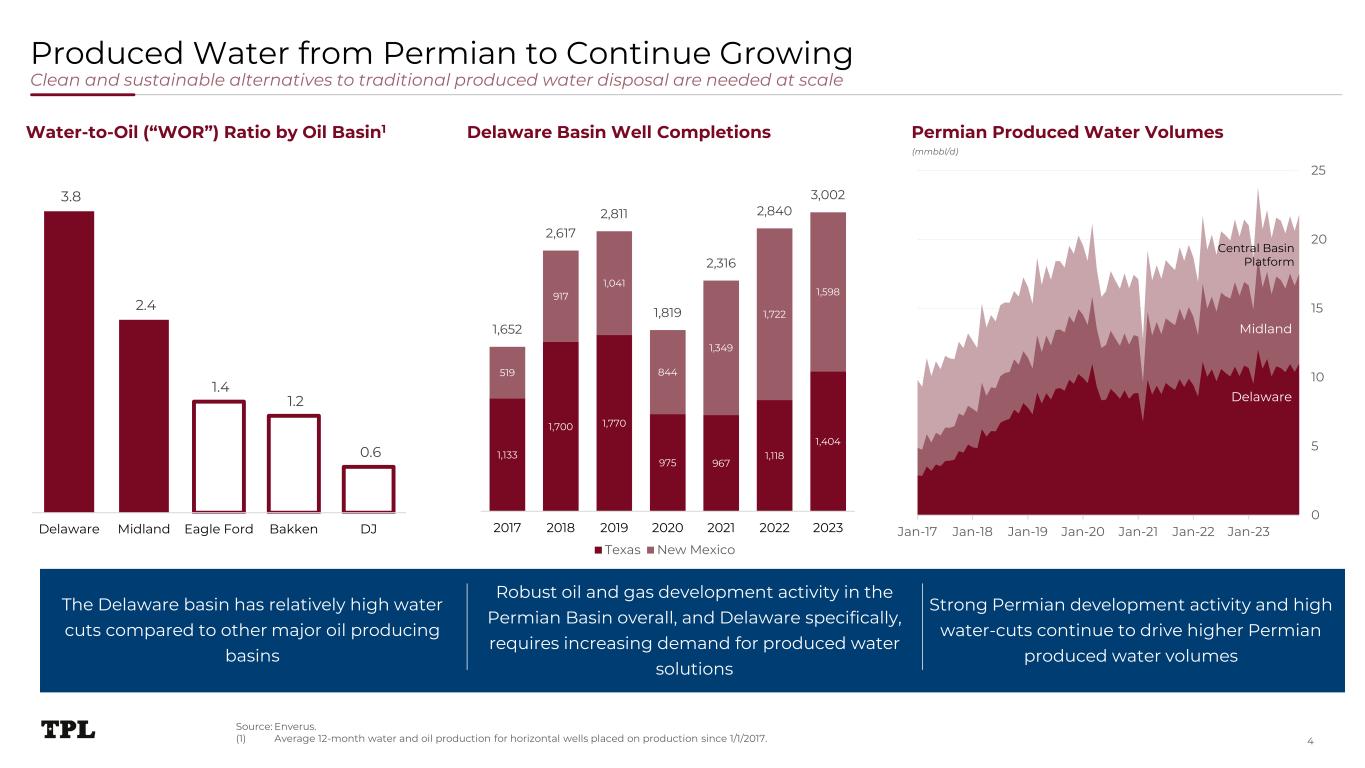 Disclaimers This presentation has been designed to provide general information about Texas Pacific Land Corporation and its subsidiaries (“TPL” or the “Company”). Any information contained or referenced herein is suitable only as an introduction to the Company. The recipient is strongly encouraged to refer to and supplement this presentation with information the Company has filed with the Securities and Exchange Commission (“SEC”). The Company makes no representation or warranty, express or implied, as to the accuracy or completeness of the information contained in this presentation, and nothing contained herein is, or shall be, relied upon as a promise or representation, whether as to the past or to the future. This presentation does not purport to include all of the information that may be required to evaluate the subject matter herein and any recipient hereof should conduct its own independent analysis of the Company and the data contained or referred to herein. Unless otherwise stated, statements in this presentation are made as of the date of this presentation, and nothing shall create an implication that the information contained herein is correct as of any time after such date. TPL reserves the right to change any of its opinions expressed herein at any time as it deems appropriate. The Company disclaims any obligations to update the data, information or opinions contained herein or to notify the market or any other party of any such changes, other than required by law. Industry and Market Data The Company has neither sought nor obtained consent from any third party for the use of previously published information. Any such statements or information should not be viewed as indicating the support of such third party for the views expressed herein. The Company shall not be responsible or have any liability for any misinformation contained in any third party report, SEC or other regulatory filing. The industry in which the Company operates is subject to a high degree of uncertainty and risk due to a variety of factors, which could cause our results to differ materially from those expressed in these third-party publications. Some of the data included in this presentation is based on TPL’s good faith estimates, which are derived from TPL’s review of internal sources as well as the third party sources described above. All registered or unregistered service marks, trademarks and trade names referred to in this presentation are the property of their respective owners, and TPL’s use herein does not imply an affiliation with, or endorsement by, the owners of these service marks, trademarks and trade names. Forward-looking Statements This presentation contains certain forward-looking statements within the meaning of the U.S. federal securities laws that are based on TPL’s beliefs, as well as assumptions made by, and information currently available to, TPL, and therefore involve risks and uncertainties that are difficult to predict. These statements include, but are not limited to, statements about strategies, plans, objectives, expectations, intentions, expenditures and assumptions and other statements that are not historical facts. When used in this document, words such as “anticipate,” “believe,” “estimate,” “expect,” “intend,” “plan” and “project” and similar expressions are intended to identify forward- looking statements. You should not place undue reliance on these forward-looking statements. Although we believe our plans, intentions and expectations reflected in or suggested by the forward-looking statements we make in this presentation are reasonable, we may be unable to achieve these plans, intentions or expectations and actual results, performance or achievements may vary materially and adversely from those envisaged in this document. For more information concerning factors that could cause actual results to differ from those expressed or forecasted, see TPL’s annual report on Form 10-K and quarterly reports on Form 10-Q filed with the SEC. The tables, graphs, charts and other analyses provided throughout this document are provided for illustrative purposes only and there is no guarantee that the trends, outcomes or market conditions depicted on them will continue in the future. There is no assurance or guarantee with respect to the prices at which the Company’s common stock will trade, and such securities may not trade at prices that may be implied herein. TPL’s forecasts and expectations for future periods are dependent upon many assumptions, including the drilling and development plans of our customers, estimates of production and potential drilling locations, which may be affected by commodity price declines or other factors that are beyond TPL’s control. These materials are provided merely for general informational purposes and are not intended to be, nor should they be construed as 1) investment, financial, tax or legal advice, 2) a recommendation to buy or sell any security, or 3) an offer or solicitation to subscribe for or purchase any security. These materials do not consider the investment objective, financial situation, suitability or the particular need or circumstances of any specific individual who may receive or review this presentation, and may not be taken as advice on the merits of any investment decision. Although TPL believes the information herein to be reliable, the Company and persons acting on its behalf make no representation or warranty, express or implied, as to the accuracy or completeness of those statements or any other written or oral communication it makes, safe as provided for by law, and the Company expressly disclaims any liability relating to those statements or communications (or any inaccuracies or omissions therein). These cautionary statements qualify all forward-looking statements attributable to us or persons acting on our behalf. Non-GAAP Financial Measures In addition to amounts pres