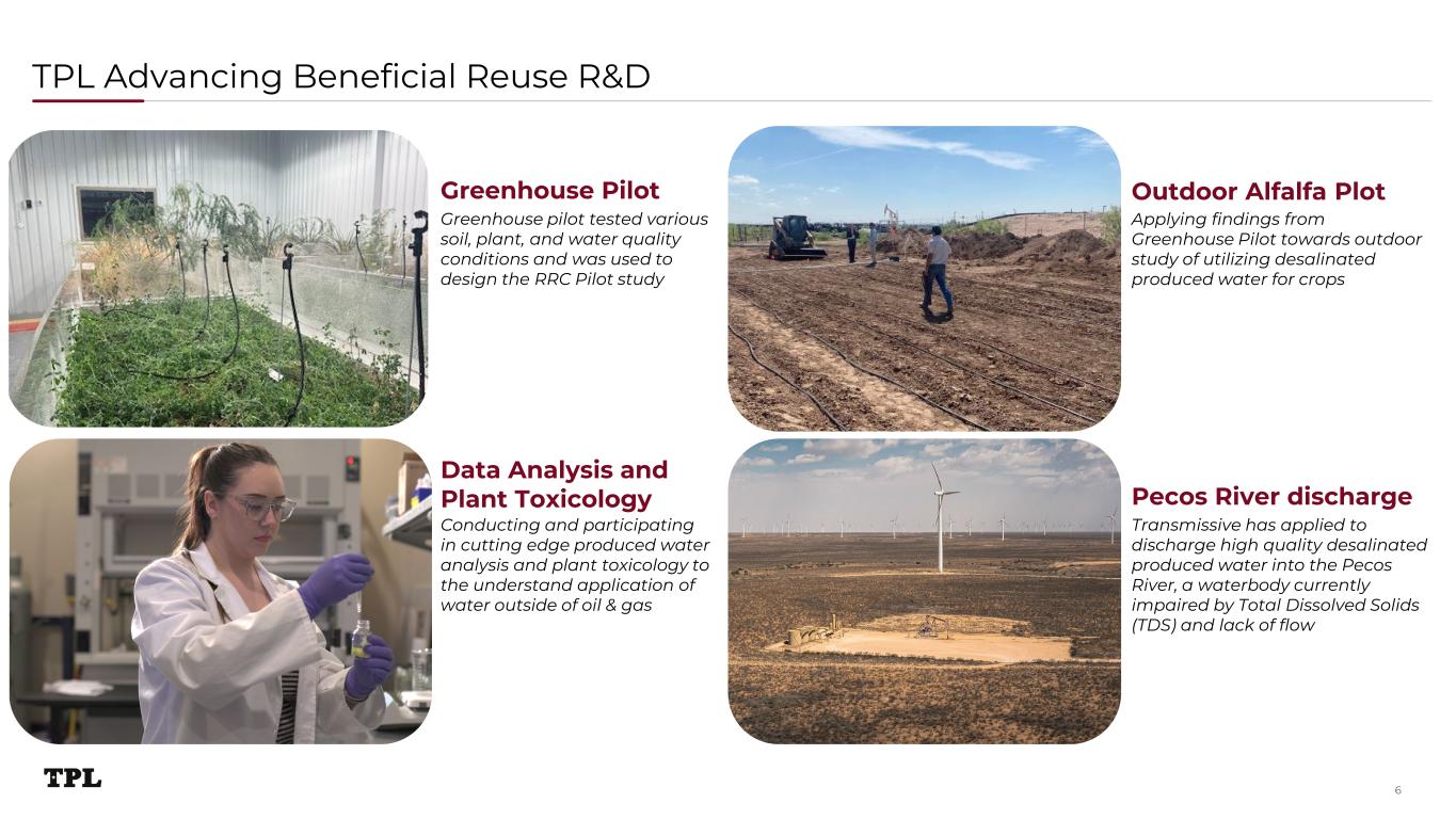 Produced Water Desalination Technology Overview 5 TPL has developed desalination technology that leverages the differing water freeze points across salinity levels Close collaboration with top-tier technology partner in the industrial freezing industry Fractional freezing more energy efficient than alternative desalination techniques Continue to make equipment and process optimizations Successful R&D trial at TPL facility in Midland; procuring equipment for a larger test facility with capacity of ~10,000 barrels of water per day 75% volume reclamation 75% analyte removal $0.75 per barrel treatment cost 25% 75% Analyte Removal Target 753 Matrix SVOCs & VOCs – almost all reduced to the TCEQ Maximum Contaminant Level PFAS levels meets current EPA recommendation Radionuclides reduced by 99.6% Metals reduced by 95.9% Plant and soil data have shown minimal changes to soil and no obvious signs of damage to plant health Working with academia to include analytes that are not traditionally analyzed Water Quality Results Desalination becomes economically competitive and environmentally superior to subsurface injection