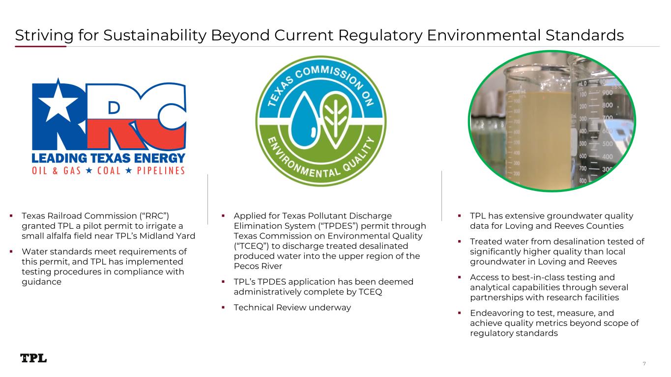 TPL Advancing Beneficial Reuse R&D 6 Greenhouse Pilot Outdoor Alfalfa Plot Data Analysis and Plant Toxicology Pecos River discharge Greenhouse pilot tested various soil, plant, and water quality conditions and was used to design the RRC Pilot study Transmissive has applied to discharge high quality desalinated produced water into the Pecos River, a waterbody currently impaired by Total Dissolved Solids (TDS) and lack of flow Conducting and participating in cutting edge produced water analysis and plant toxicology to the understand application of water outside of oil & gas Applying findings from Greenhouse Pilot towards outdoor study of utilizing desalinated produced water for crops