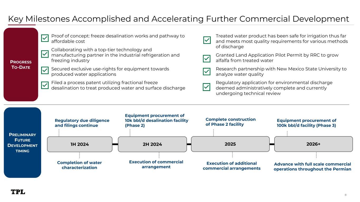 Striving for Sustainability Beyond Current Regulatory Environmental Standards 7 Texas Railroad Commission (“RRC”) granted TPL a pilot permit to irrigate a small alfalfa field near TPL’s Midland Yard Water standards meet requirements of this permit, and TPL has implemented testing procedures in compliance with guidance Applied for Texas Pollutant Discharge Elimination System (“TPDES”) permit through Texas Commission on Environmental Quality (“TCEQ”) to discharge treated desalinated produced water into the upper region of the Pecos River TPL’s TPDES application has been deemed administratively complete by TCEQ Technical Review underway TPL has extensive groundwater quality data for Loving and Reeves Counties Treated water from desalination tested of significantly higher quality than local groundwater in Loving and Reeves Access to best-in-class testing and analytical capabilities through several partnerships with research facilities Endeavoring to test, measure, and achieve quality metrics beyond scope of regulatory standards