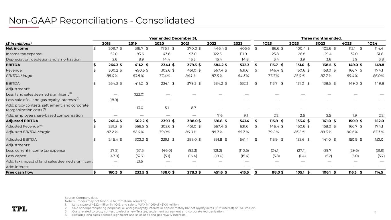 Year ended December 31, Three months ended, ($ in millions) 2018 2019 2020 2021 2022 2023 1Q23 2Q23 3Q23 4Q23 1Q24 Net income 209.7$ 318.7$ 176.1$ 270.0$ 446.4$ 405.6$ 86.6$ 100.4$ 105.6$ 113.1$ 114.4$ Income tax expense 52.0 83.6 43.6 93.0 122.5 111.9 23.8 26.8 29.4 32.0 31.6 Depreciation, depletion and amortization 2.6 8.9 14.4 16.3 15.4 14.8 3.4 3.9 3.6 3.9 3.8 EBITDA 264.3$ 411.2$ 234.1$ 379.3$ 584.2$ 532.3$ 113.7$ 131.0$ 138.5$ 149.0$ 149.8$ Revenue 300.2$ 490.5$ 302.6$ 451.0$ 667.4$ 631.6$ 146.4$ 160.6$ 158.0$ 166.7$ 174.1$ EBITDA Margin 88.0% 83.8 % 77.4% 84.1 % 87.5 % 84.3% 77.7 % 81.6 % 87.7 % 89.4% 86.0% EBITDA 264.3$ 411.2$ 234.1$ 379.3$ 584.2$ 532.3$ 113.7$ 131.0$ 138.5$ 149.0$ 149.8$ Adjustments: Less: land sales deemed significant — (122.0) — — — — — — — — — Less: sale of oil and gas royalty interests (18.9) — — — — — — — — — — Add: proxy contests, settlement, and corporate reorganization costs — 13.0 5.1 8.7 — — — — — — — Add: employee share-based compensation — — — — 7.6 9.1 2.2 2.6 2.5 1.9 2.2 Adjusted EBITDA 245.4$ 302.2$ 239.1$ 388.0$ 591.8$ 541.4$ 115.9$ 133.6$ 141.0$ 150.9$ 152.0$ Adjusted Revenue 281.3$ 368.5$ 302.6$ 451.0$ 667.4$ 631.6$ 146.4$ 160.6$ 158.0$ 166.7$ 174.1$ Adjusted EBITDA Margin 87.2 % 82.0 % 79.0% 86.0% 88.7 % 85.7 % 79.2 % 83.2 % 89.3 % 90.6% 87.3 % Adjusted EBITDA 245.4$ 302.2$ 239.1$ 388.0$ 591.8$ 541.4$ 115.9$ 133.6$ 141.0$ 150.9$ 152.0$ Adjustments: Less: current income tax expense (37.2) (57.5) (46.0) (93.3) (121.2) (110.5) (24.1) (27.1) (29.7) (29.6) (31.9) Less: capex (47.9) (32.7) (5.1) (16.4) (19.0) (15.4) (3.8) (1.4) (5.2) (5.0) (5.7) Add: tax impact of land sales deemed significant — 21.5 — — — — — — — — — Add: interest — — — — — — — — — — — Free cash flow 160.3$ 233.5$ 188.0$ 278.3$ 451.6$ 415.5$ 88.0$ 105.1$ 106.1$ 116.3$ 114.5$ Non-GAAP Reconciliations - Consolidated Source: Company data. Note: Numbers may not foot due to immaterial rounding. 1. Land swap of ~$22 million in 4Q19, and sale to WPX in 1Q19 of ~$100 million. 2. Sale of nonparticipating perpetual oil and gas royalty interest in approximately 812 net royalty acres (1/8th interest) of ~$19 million. 3. Costs related to proxy contest to elect a new Trustee, settlement agreement and corporate reorganization. 4. Excludes land sales deemed significant and sales of oil and gas royalty interests. 13 (1) (2) (3) (4)