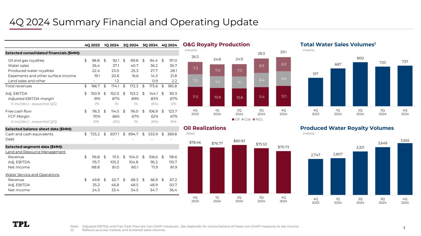 4Q 2023 1Q 2024 2Q 2024 3Q 2024 4Q 2024 Selected consolidated financials ($MM): Oil and gas royalties 98.8$ 92.1$ 89.8$ 94.4$ 97.0$ Water sales 26.4 37.1 40.7 36.2 36.7 Produced water royalties 22.4 23.0 25.3 27.7 28.1 Easements and other surface income 19.1 20.6 16.6 14.3 21.8 Land sales and other - 1.2 - 0.9 2.2 Total revenues 166.7$ 174.1$ 172.3$ 173.6$ 185.8$ Adj. EBITDA 150.9$ 152.0$ 153.2$ 144.1$ 161.3$ Adjusted EBITDA margin 91% 87% 89% 83% 87% % inc/(dec) - sequential Q/Q 7% 1% 1% (6%) 12% Free cash flow 116.3$ 114.5$ 116.0$ 106.9$ 123.7$ FCF Margin 70% 66% 67% 62% 67% % inc/(dec) - sequential Q/Q 10% (2%) 1% (8%) 16% Selected balance sheet data ($MM): Cash and cash equivalents 725.2$ 837.1$ 894.7$ 533.9$ 369.8$ Debt - - - - - Selected segment data ($MM): Land and Resource Management Revenue 116.8$ 111.5$ 104.0$ 106.6$ 118.6$ Adj. EBITDA 115.7 105.2 104.8 95.2 110.7 Net Income 88.8 81.0 80.1 71.9 81.9 Water Service and Operations Revenue 49.8$ 62.7$ 68.3$ 66.9$ 67.2$ Adj. EBITDA 35.2 46.8 48.5 48.9 50.7 Net Income 24.3 33.4 34.5 34.7 36.4 $78.46 $76.77 $80.93 $75.53 $70.73 4Q 2023 1Q 2024 2Q 2024 3Q 2024 4Q 2024 11.5 10.9 10.6 11.4 12.1 7.5 7.0 7.1 8.4 8.6 7.3 7.0 7.3 8.5 8.3 26.3 24.8 24.9 28.3 29.1 4Q 2023 1Q 2024 2Q 2024 3Q 2024 4Q 2024 Oil Gas NGL 517 687 800 720 737 4Q 2023 1Q 2024 2Q 2024 3Q 2024 4Q 2024 4Q 2024 Summary Financial and Operating Update 3 O&G Royalty Production Total Water Sales Volumes1 Oil Realizations Produced Water Royalty Volumes (mboe/d) (mbbl/d) ($/bbl) (mbbl/d) 2,747 2,807 3,321 3,649 3,955 4Q 2023 1Q 2024 2Q 2024 3Q 2024 4Q 2024 Note: Adjusted EBITDA and Free Cash Flow are non-GAAP measures. See Appendix for reconciliations of these non-GAAP measures to net income. (1) Reflects sourced, treated, and brokered sales volumes