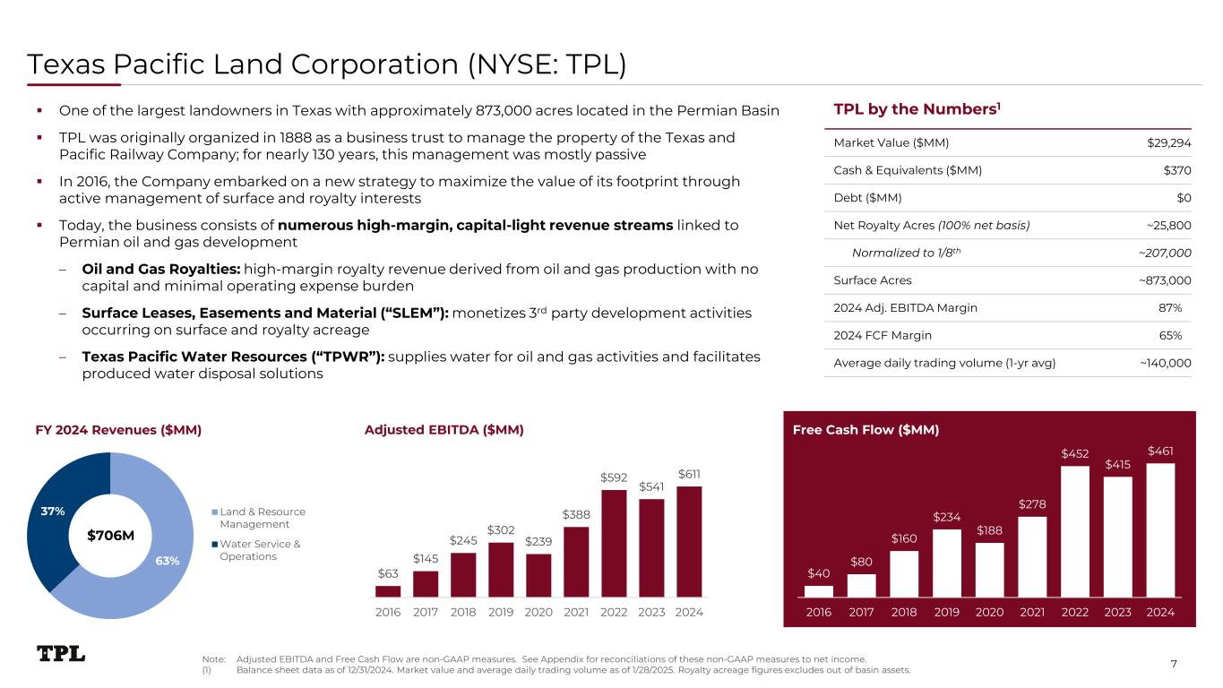 Unique Permian Basin Pure-Play $ $ Positioned to capture upside $611 Million 2024 Adjusted EBITDA Balance Sheet Strength No Debt Cash Balance of $370 Million ~25,800 Core Permian Net Royalty Acres ~873,000 Surface Acres Diversified Revenue Streams: Royalties, Water, and Surface 100% Permian Exposure Efficient conversion of revenues to cash $461 Million 2024 Free Cash Flow Robust Inventory of 793 DUCs and 506 Permits Decades of Cash Flow Runway Across Multiple Businesses ~300% Production growth since 2018 $$ 6Note: Operating, balance sheet, and well inventory data as of 12/31/2024.