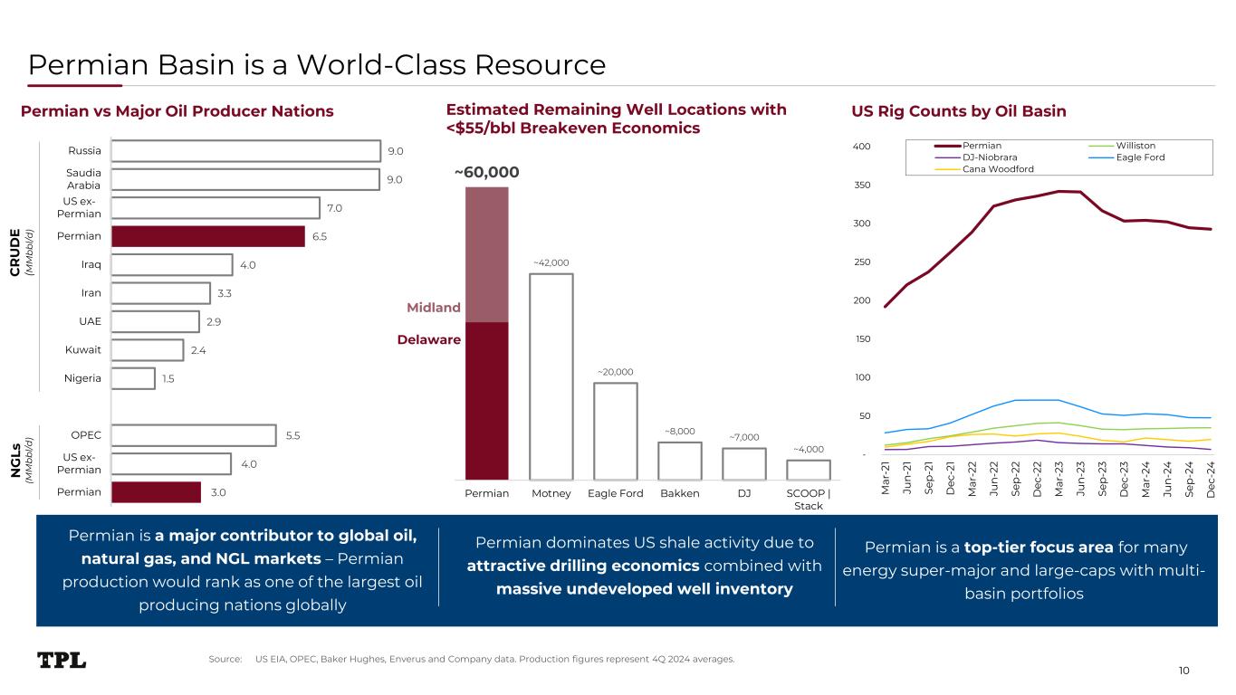 ~60,000 ~42,000 ~20,000 ~8,000 ~7,000 ~4,000 Permian Motney Eagle Ford Bakken DJ SCOOP | Stack Permian Basin is a World-Class Resource Source: US EIA, OPEC, Baker Hughes, Enverus and Company data. Production figures represent 4Q 2024 averages. Estimated Remaining Well Locations with <$55/bbl Breakeven Economics Permian dominates US shale activity due to attractive drilling economics combined with massive undeveloped well inventory Permian is a top-tier focus area for many energy super-major and large-caps with multi- basin portfolios Permian is a major contributor to global oil, natural gas, and NGL markets – Permian production would rank as one of the largest oil producing nations globally 3.0 4.0 5.5 1.5 2.4 2.9 3.3 4.0 6.5 7.0 9.0 9.0 Permian US ex- Permian OPEC Nigeria Kuwait UAE Iran Iraq Permian US ex- Permian Saudia Arabia Russia C R U D E (M M b b l/d ) N G Ls (M M b b l/d ) Permian vs Major Oil Producer Nations US Rig Counts by Oil Basin Delaware Midland 10 - 50 100 150 200 250 300 350 400 M ar -2 1 Ju n -2 1 Se p -2 1 D ec -2 1 M ar -2 2 Ju n -2 2 Se p -2 2 D ec -2 2 M ar -2 3 Ju n -2 3 Se p -2 3 D ec -2 3 M ar -2 4 Ju n -2 4 Se p -2 4 D ec -2 4 Permian Williston DJ-Niobrara Eagle Ford Cana Woodford