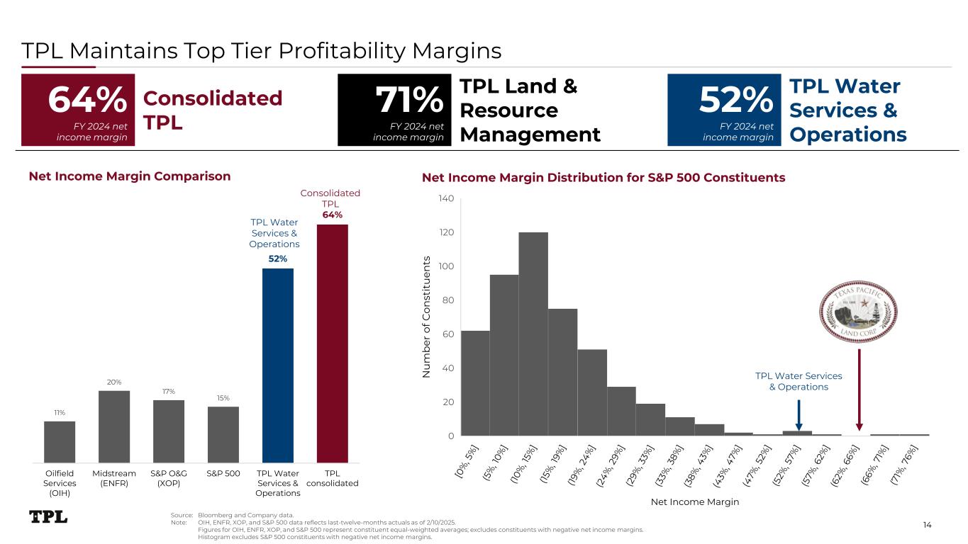 TPL Maintains Top Tier Profitability Margins 11% 20% 17% 15% 52% 64% Oilfield Services (OIH) Midstream (ENFR) S&P O&G (XOP) S&P 500 TPL Water Services & Operations TPL consolidated Net Income Margin Comparison Source: Bloomberg and Company data. Note: OIH, ENFR, XOP, and S&P 500 data reflects last-twelve-months actuals as of 2/10/2025. Figures for OIH, ENFR, XOP, and S&P 500 represent constituent equal-weighted averages; excludes constituents with negative net income margins. Histogram excludes S&P 500 constituents with negative net income margins. Consolidated TPL TPL Water Services & Operations Net Income Margin N u m b er o f C on st it u en ts 0 20 40 60 80 100 120 140 Net Income Margin Distribution for S&P 500 Constituents Consolidated TPL 64% FY 2024 net income margin TPL Land & Resource Management 71% FY 2024 net income margin TPL Water Services & Operations 52% FY 2024 net income margin TPL Water Services & Operations 14