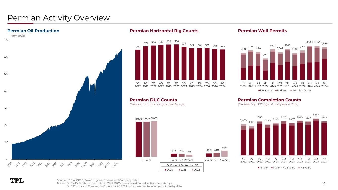 38.2 39.2 41.6 43.7 45.0 47.1 47.8 50.1 52.4 54.5 59.3 62.3 11.6 12.0 12.5 13.0 13.4 14.5 14.0 16.2 16.8 17.7 18.8 23.4 50.7 52.1 55.0 57.7 59.4 62.6 62.8 67.2 70.2 73.3 79.2 86.8 10.00 20.00 30.00 40.00 50.00 60.00 70.00 80.00 90.00 1Q 2022 2Q 2022 3Q 2022 4Q 2022 1Q 2023 2Q 2023 3Q 2023 4Q 2023 1Q 2024 2Q 2024 3Q 2024 4Q 2024 Delaware Midland Permian Other TPL Royalty Production and Inventory Detail 0% 20% 40% 60% 80% 100% 120% 140% 1Q 2022 2Q 2022 3Q 2022 4Q 2022 1Q 2023 2Q 2023 3Q 2023 4Q 2023 1Q 2024 2Q 2024 3Q 2024 4Q 2024 Oil as % of WTI Gas as % of Henry Hub NGLs as % of WTI 7.4 8.7 5.6 5.0 5.0 4.9 6.7 4.5 5.1 6.3 6.9 6.4 7.7 7.5 6.9 7.4 7.8 8.2 7.9 9.7 10.3 9.5 11.8 13.2 1.8 2.9 2.9 2.3 3.3 2.3 5.2 2.8 2.2 4.0 3.4 3.0 16.9 19.1 15.4 14.7 16.1 15.4 19.8 17.0 17.6 19.8 22.1 22.6 (1.0) 4.0 9.0 14.0 19.0 24.0 1Q 2022 2Q 2022 3Q 2022 4Q 2022 1Q 2023 2Q 2023 3Q 2023 4Q 2023 1Q 2024 2Q 2024 3Q 2024 4Q 2024 Permits DUCs Completed 1.7 2.7 3.3 5.1 8.8 13.7 16.2 18.6 21.3 23.5 26.8 2014 2015 2016 2017 2018 2019 2020 2021 2022 2023 2024 TPL Net Royalty Production (mboe/d) TPL Average Lateral Lengths (feet) – New Spuds1 TPL Commodity Price Realizations vs Benchmarks 9,661 10,031 10,225 10,902 10,731 10,702 2019 2020 2021 2022 2023 2024 22 TPL Producing Wells (net)TPL Inventory (net) (1) Enverus well data as of 12/31/2024.